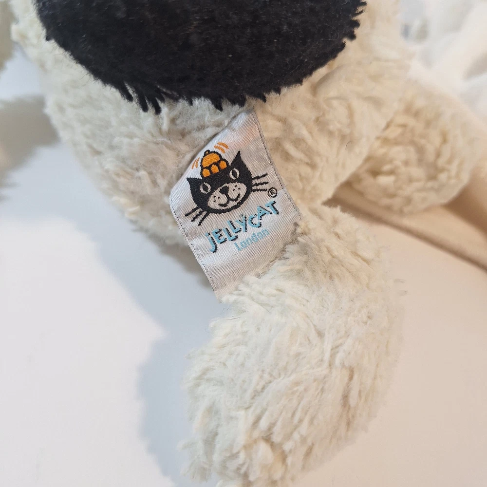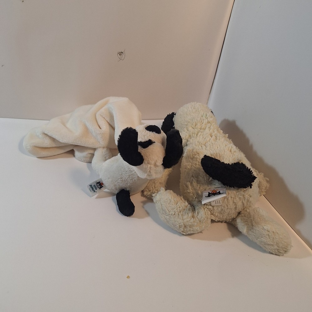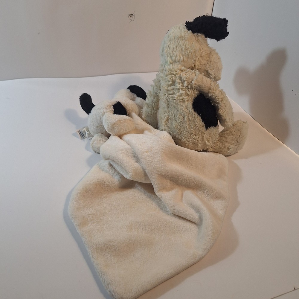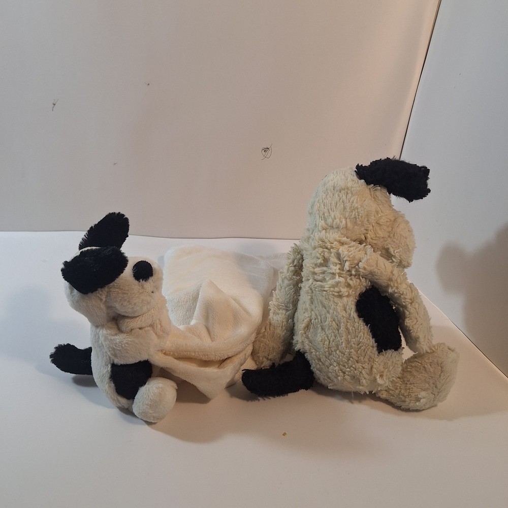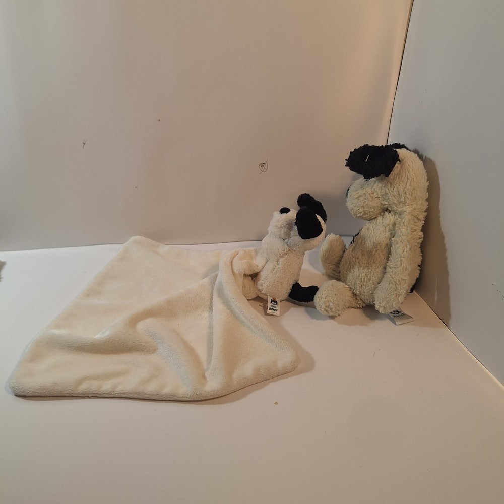 The Jellycat Baby Dog White Black & Security Blanket Lovey is a cute and cuddly stuffed animal perfect for babies and young children. This adorable plush toy features a black and white design with a soft security blanket for added comfort and security. The Jellycat brand is known for its high-quality and huggable stuffed animals, making this a great addition to any child's toy collection.