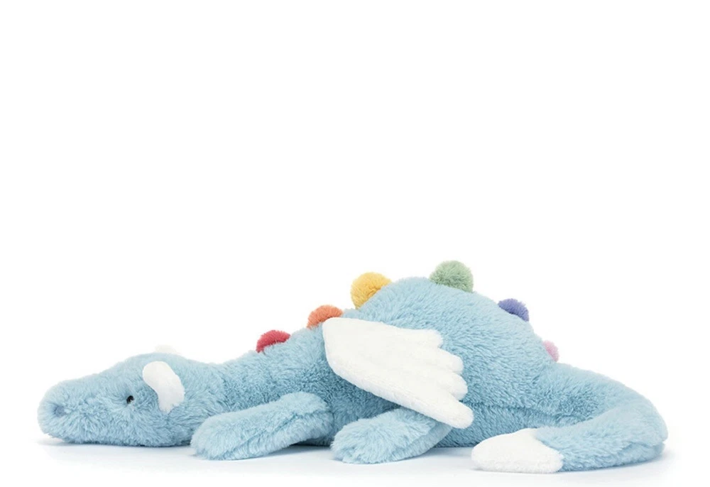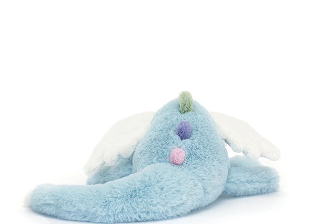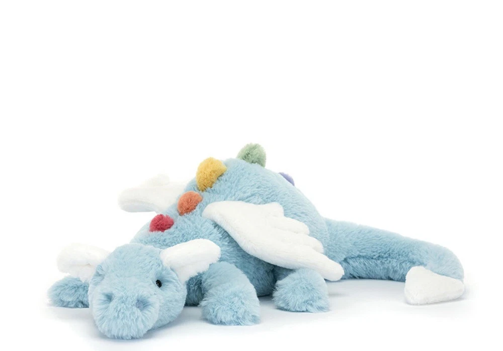 Prepare to be dazzled as Sky Dragon comes in to land! This magical friend has a long sky-blue body and soft rainbow spines from back to tail! With a cuddly snout, bobble nostrils and cloud-white wings, ears and tail dart, this sleepy dragon is an absolute dream. Dimensions: 4.7in x 5.5in x 19.7in Sitting Height: 4in Wingspan: 9in Main Materials: Polyester Inner Filling: Polyester Fibers, PE Beans Hard Eye Care Instructions: 86 degree Fahrenheit wash only. Do not tumble dry, dry clean, or iron. Check all labels upon arrival of purchase Safety Recommendations: Please do not leave in a cot/crib due to its size, Suitable from birth