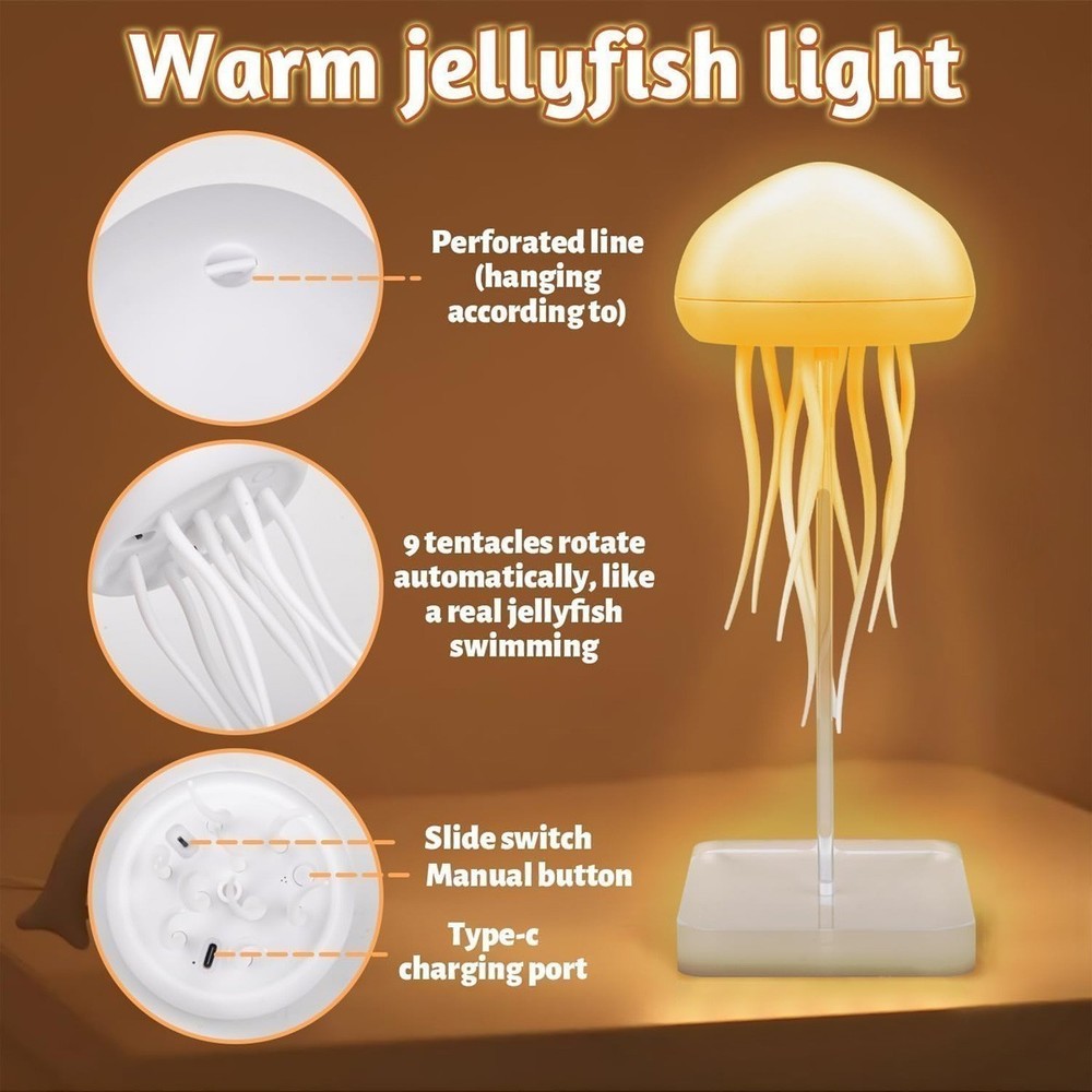 Product Description Feature: 1. Mesmerizing Sea Experience: The creative jellyfish light brings the tranquility of the ocean to your home with its lifelike swimming motion and full-color, auto-cycling gradient lighting effects, creating a serene underwater ambiance in any room. 2. Intuitive Design & Rotation: With nine rotatable tentacles, the LED smart jellyfish night light mimics the natural movement of a jellyfish, captivating onlookers with its graceful and hypnotic dance, perfect for sparking imagination and wonder. 3. Extended Battery Life & Versatility: The bedroom bedside deformable lamp is equipped with a 1000mAh lithium battery and convenient Type-C charging, offering long-lasting illumination. It's versatile enough for a nightstand, atmospheric lighting in cafes, bars, or even outdoor settings like camping trips and milk tea stands. 4. Cute & Safe Build: This cartoon jellyfish-shape night light is designed for both hanging and standing installation, with a cute, glowing form that brings joy to both children and adults. Its smooth, rounded edges ensure safety, preventing any hand injuries during use or when adjusting the light. Specification: Is Bulbs Included: Yes Shape: Mushroom Type: Atmosphere Body Material: Plastic Size: 85x85x222mm Style: Modern and simple Model: night light/atmosphere light Function: Full-color gradient, smart touch feet Installation method: can be erected Note: Due to the different monitor and light effect, the actual color of the item might be slightly different from the color showed on the pictures. Thank you! Please allow 1-2cm measuring deviation due to manual measurement.