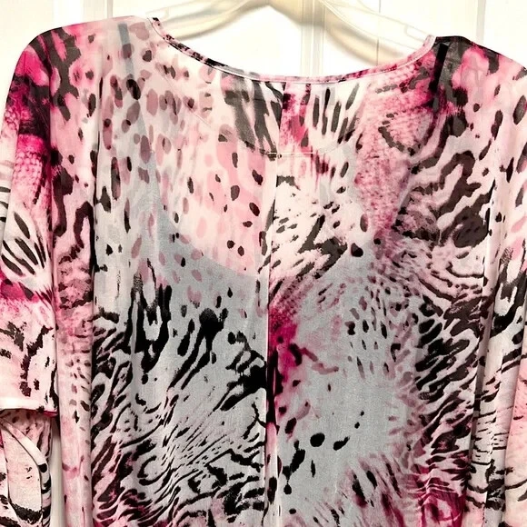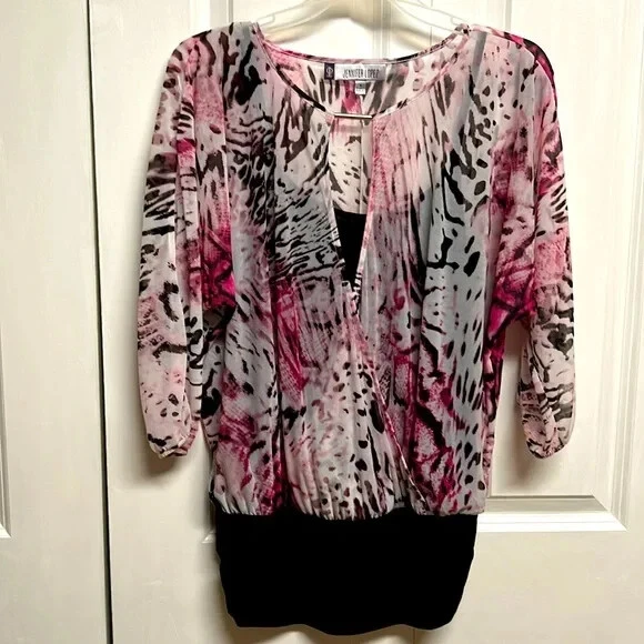 Elevate your wardrobe with this stunning Jennifer Lopez blouse featuring a unique pink and black abstract print. The blouse has a V-neckline and 3/4 dolman sleeves, making it perfect for any occasion, whether it's a casual day out or a fancy party. The lightweight, stretchy material with a shearling fabric type ensures a comfortable fit, while the collarless design and pullover closure add a touch of convenience. This blouse is perfect for the summer, fall, or spring seasons and can be easily paired with any bottom, whether it's jeans, a skirt, or shorts. The blouse is hand wash only and comes in size S. With its hipster, designer, and colorful theme, this blouse is a must-have for any fashion-forward woman. Very good pre owned condition mesh Shell 100% sheer polyester jersey Shell 95% polyester 5% spandex lining 95% polyester 5% spandex 16’ across chest inside top 16.50’ across bottom band side gathers 27’ long from collar seam to bottom front elastic around end of sleeve