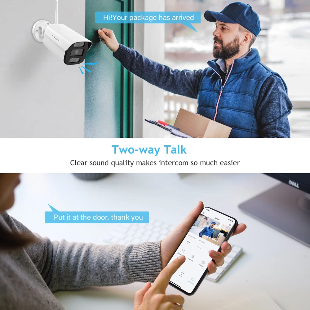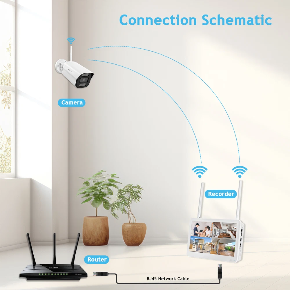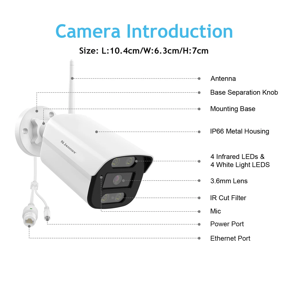 NVR can connect up to 10 cameras Please select the number of cameras in the set according to your needs, the power supply and screws will also be included in sufficient quantity. 5MP UHD Video Capture 2560*1920 Mega Pixels about 1.5 times clearer than 1080P. Camera with 4 array Infrared LED allows you to see up to 65ft night vision even in darkness. Plug & Play Connection diagram 1. Power the camera 2. Power on NVR 3. Connect display 4. Automatically match camera to show video (Schematic is for reference only, does not mean that the products sold on this page are the same) Human Motion Detection & Real Time Alerts The System can reduce false alarms with a human filtering function and receive instant alerts on your phone when motion is detected. Alert notifications will be sent to your phone immediately if human motion is detected. It supports adjusted sensibility to ensure you won't be disturbed by frequent alarms. Zone Detection Jennov's Zone Detection: A smart feature allowing you to set specific areas for motion detection. Minimize false alarms and enhance surveillance accuracy by focusing alerts to designated 'zones' such as entrances or driveways. 2-Way Talk The wireless security camera system comes with advanced noise-filtering microphone and speaker, ensuring clear and fluent voice communication between the app and the cameras. No matter where you are, you can easily share joy with your kids or interact with your pet. It also allows you to keep unwelcome guests at bay Smart Recording Modes Save your time and energy over general motion detection. You can also set and apply general motion detection or 24/7 recording as needed. IP66 Waterproof Metal Security Camera The camera's metal body can withstand temperatures as low as -4°F (-20°C), ensuring uninterrupted security surveillance year-round. Works with Alexa This security system is able to work with Amazon Alexa, allowing engaging voice control to take a glance at your rooms or yards. Auto Pairing and WiFi Repeater Once connected to power, the Wi-Fi cameras will pair with the NVR automatically without any manual setting. The nearest wifi-connected camera can serve as a repeater to bolster the connection distance. H.265+ Video Compression,More Save HDD Space Saving up to 50% of storage space than H.264 coding without losing 5MP clarity. You will enjoy smooth & fast live stream without latency. Free Local & Cloud Recording 2TB HDD stores months of video before overwriting old files. Or pay for a paid order cloud storage service and don't worry about hard drive damage and lost playback footage. NVR supports hard drives up to 6TB (not included) NVR Multi-Language Support The NVR support 11 languages ,English,Korean, Japanese, Portuguese, Spanish, German, etc. Camera Camera Video Pixels 5MP Image Sensor 1/2.8" Progressive Scan CMOS Audio Compression G.711A Video Compression H.265+ Lens 3.6mm Angle of View 70° Audio Input/Output Build in microphone & speaker, support 2 way audio Number of Infrared LEDs 4 Night Vision Distance Up to 100 ft/30 m IR-Cut Filter Yes Ethernet RJ45 X1 General Wireless IEEE802.11b/g/n Housing Metal Operating Temperature 14 °F ~ 131 °F/-10 °C ~ 55 °C Operating Power DC 12V Applicable Scenarios Indoor/Outdoor Weatherproof Rating IP66 12" Monitor NVR Video & Audio Video Compression: H.265+ / H.264+ IP Video Input 10 CH Video Output HDMI Audio Output Self-contained speaker on top Max Playback Channel 4 CH Hard Drive HDD 1 SATA Interface Supports up to capacity Up to 6TB Capacity External Interface Network Interface RJ45 X1 Wireless Antenna 2 Ports (IEEE802.11b/g/n) USB 1X USB 2.0 WiFi 2.4 GHz (Built-in Antenna) General Housing Plastic Operating Power DC 12V Power Consumption 6W (Without HDD) Working Temperature 14 °F ~ 131 °F/-10 °C ~ 55 °C