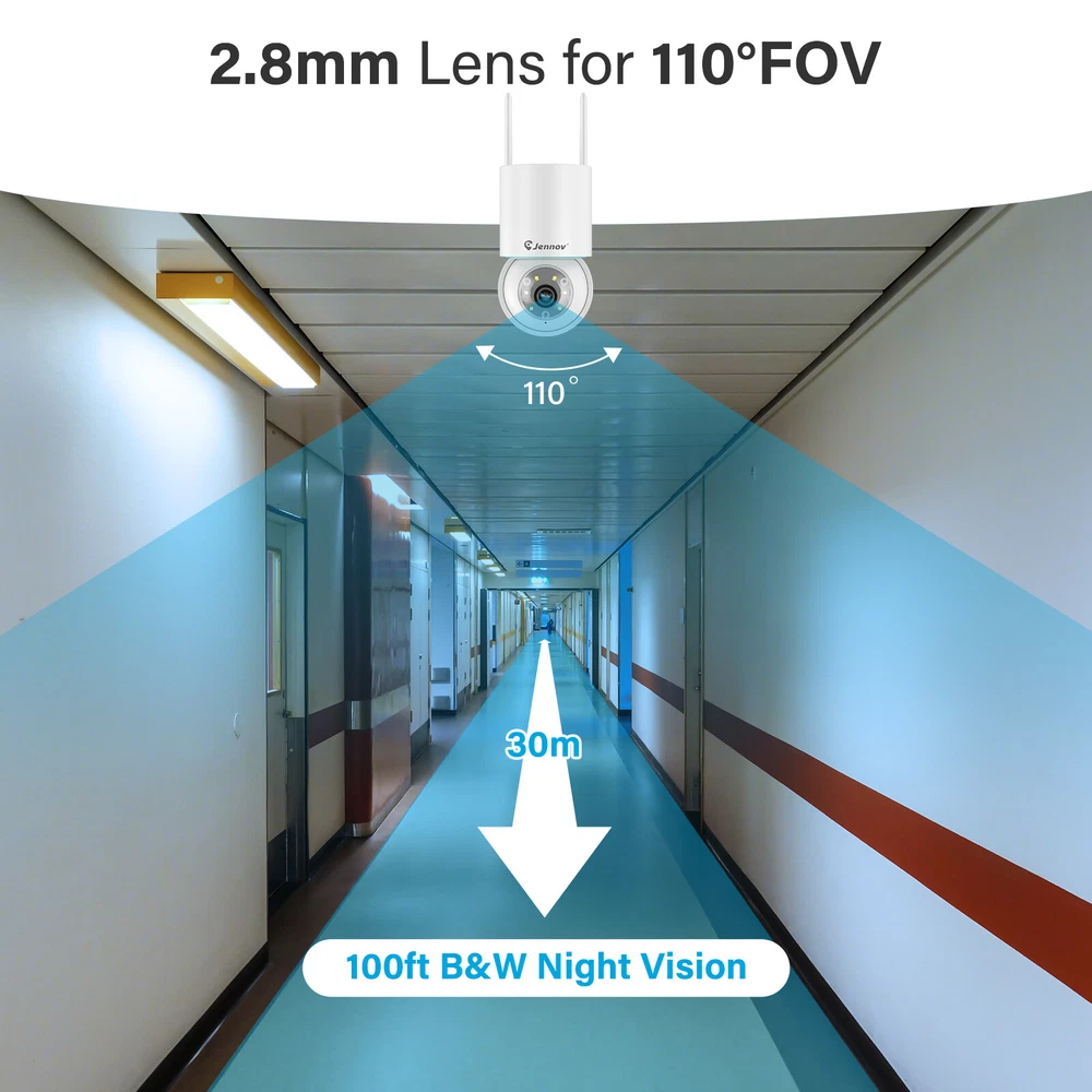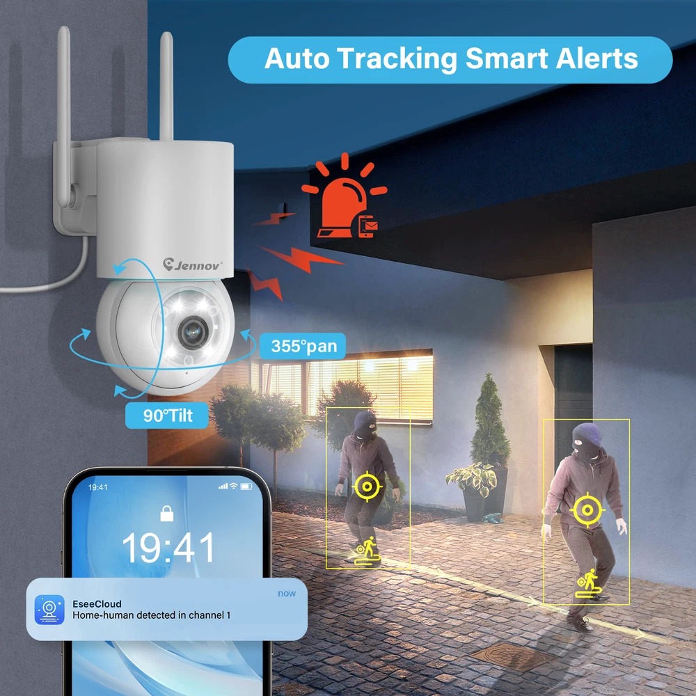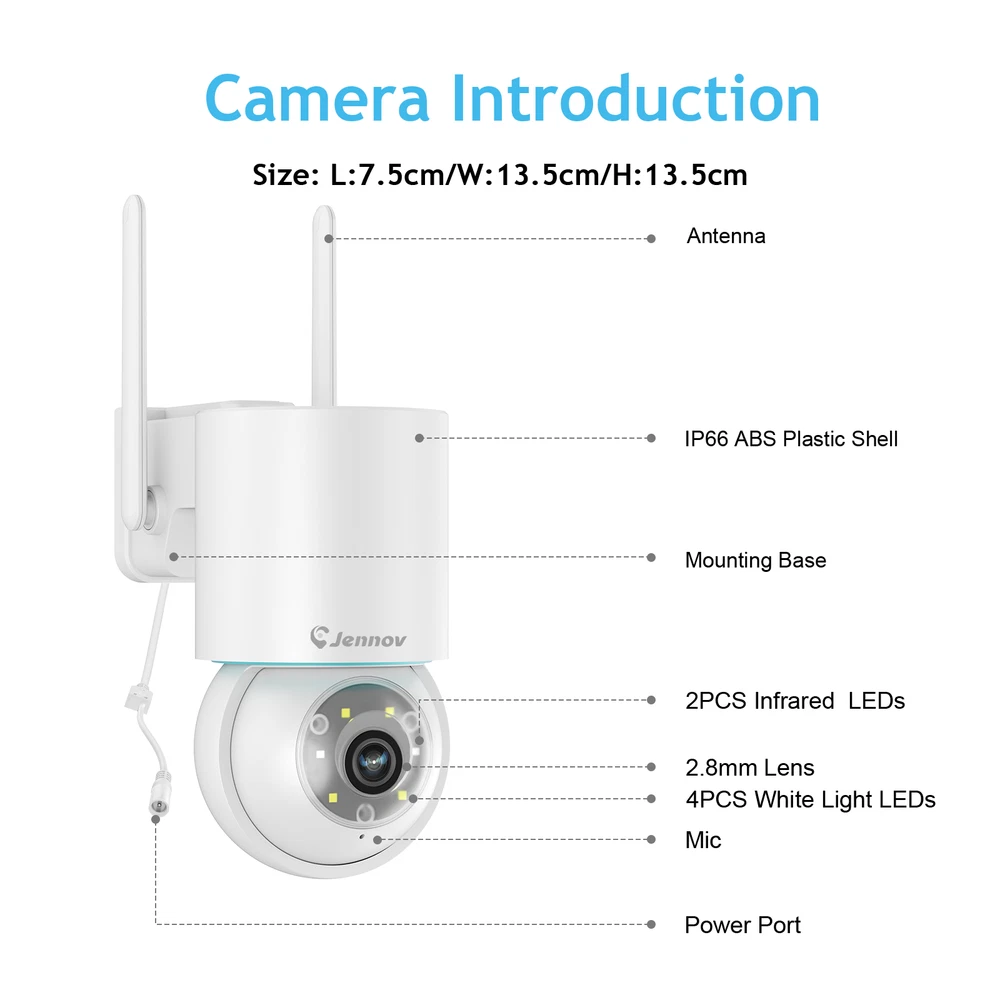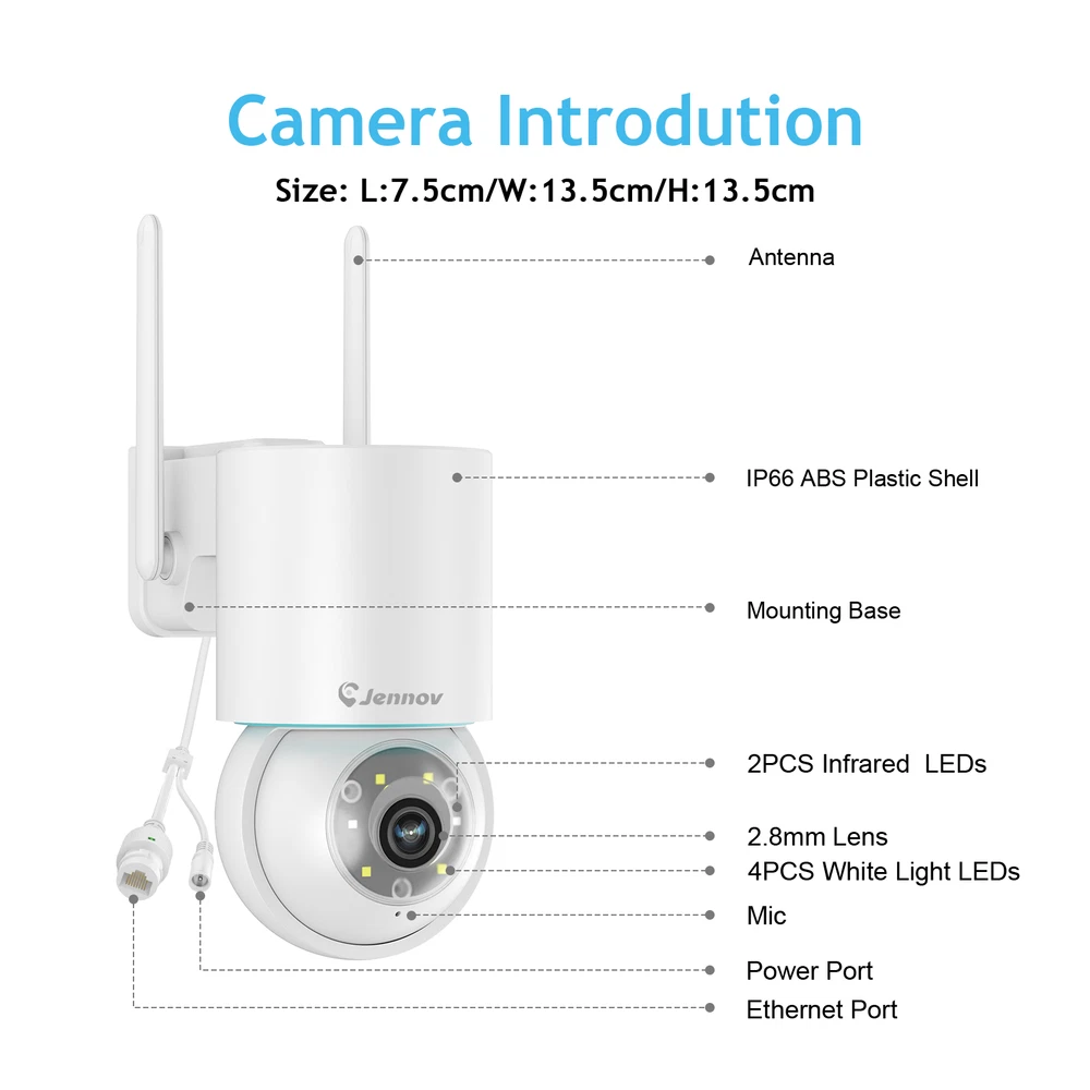 Please select the number of cameras in the set according to your needs, the power supply and screws will also be included in sufficient quantity. 5MP UHD Video Capture 2560*1920 Mega Pixels about 1.5 times clearer than 1080P. Camera with 4 array Infrared LED allows you to see up to 65ft night vision even in darkness. Option to add PTZ camera, can achieve panning 355 °, vertical 90 °, omni-directional monitoring, and PTZ camera has automatic tracking function, compared with Bullet cam it can be better to monitor a wide range of areas Plug & Play Connection diagram 1. Power the camera 2. Power on NVR 3. Connect display 4. Automatically match camera to show video (Schematic is for reference only, does not mean that the products sold on this page are the same) Human Motion Detection & Real Time Alerts The System can reduce false alarms with a human filtering function and receive instant alerts on your phone when motion is detected. Alert notifications will be sent to your phone immediately if human motion is detected. It supports adjusted sensibility to ensure you won't be disturbed by frequent alarms. Zone Detection Jennov's Zone Detection: A smart feature allowing you to set specific areas for motion detection. Minimize false alarms and enhance surveillance accuracy by focusing alerts to designated 'zones' such as entrances or driveways. 2-Way Talk The wireless security camera system comes with advanced noise-filtering microphone and speaker, ensuring clear and fluent voice communication between the app and the cameras. No matter where you are, you can easily share joy with your kids or interact with your pet. It also allows you to keep unwelcome guests at bay Smart Recording Modes Save your time and energy over general motion detection. You can also set and apply general motion detection or 24/7 recording as needed. IP66 Waterproof Metal Security Camera The camera's metal body can withstand temperatures as low as -4°F (-20°C), ensuring uninterrupted security surveillance year-round. Works with Alexa This security system is able to work with Amazon Alexa, allowing engaging voice control to take a glance at your rooms or yards. Auto Pairing and WiFi Repeater Once connected to power, the Wi-Fi cameras will pair with the NVR automatically without any manual setting. The nearest wifi-connected camera can serve as a repeater to bolster the connection distance. H.265+ Video Compression,More Save HDD Space Saving up to 50% of storage space than H.264 coding without losing 5MP clarity. You will enjoy smooth & fast live stream without latency. Free Local & Cloud Recording 1TB HDD stores months of video before overwriting old files. Or pay for a paid order cloud storage service and don't worry about hard drive damage and lost playback footage. NVR supports hard drives up to 6TB (not included) NVR Multi-Language Support The NVR support 11 languages ,English,Korean, Japanese, Portuguese, Spanish, German, etc. Camera Camera Video Pixels 5MP Image Sensor 1/2.8" Progressive Scan CMOS Audio Compression G.711A Video Compression H.265+ Lens 3.6mm Angle of View 70° Audio Input/Output Build in microphone & speaker, support 2 way audio Number of Infrared LEDs 4 Night Vision Distance Up to 100 ft/30 m IR-Cut Filter Yes Ethernet RJ45 X1 General Wireless IEEE802.11b/g/n Housing Metal Operating Temperature 14 °F ~ 131 °F/-10 °C ~ 55 °C Operating Power DC 12V Applicable Scenarios Indoor/Outdoor Weatherproof Rating IP66 12" Monitor NVR Video & Audio Video Compression: H.265+ / H.264+ IP Video Input 10 CH Video Output HDMI Audio Output Self-contained speaker on top Max Playback Channel 4 CH Hard Drive HDD 1 SATA Interface Supports up to capacity Up to 6TB Capacity External Interface Network Interface RJ45 X1 Wireless Antenna 2 Ports (IEEE802.11b/g/n) USB 1X USB 2.0 WiFi 2.4 GHz (Built-in Antenna) General Housing Plastic Operating Power DC 12V Power Consumption 6W (Without HDD) Working Temperature 14 °F ~ 131 °F/-10 °C ~ 55 °C PTZ Camera Camera Video Pixels 5MP Image Sensor 1/2.8" Progressive Scan CMOS Audio Compression G.711A Video Compression H.265+ Lens 2.8mm Angle of View 110° Audio Input/Output Build in microphone & speaker, support 2 way audio Number of Infrared LEDs 2 Night Vision Distance Up to 100 ft/30 m IR-Cut Filter Yes Ethernet RJ45 X1 General Wireless IEEE802.11b/g/n Housing Plastic Operating Temperature 14 °F ~ 131 °F/-10 °C ~ 55 °C Operating Power DC 12V Applicable Scenarios Indoor/Outdoor Weatherproof Rating IP66 The J-Series universal add-on cameras are as follows If you'd like to buy other J Series add on camera, you can click on the link below or search for them in the store! https://www.ebay.com/itm/116217725838 (A95) https://www.ebay.com/itm/355819262950 (A61) https://www.ebay.com/itm/355877289316 (P41) P41 A61 A95