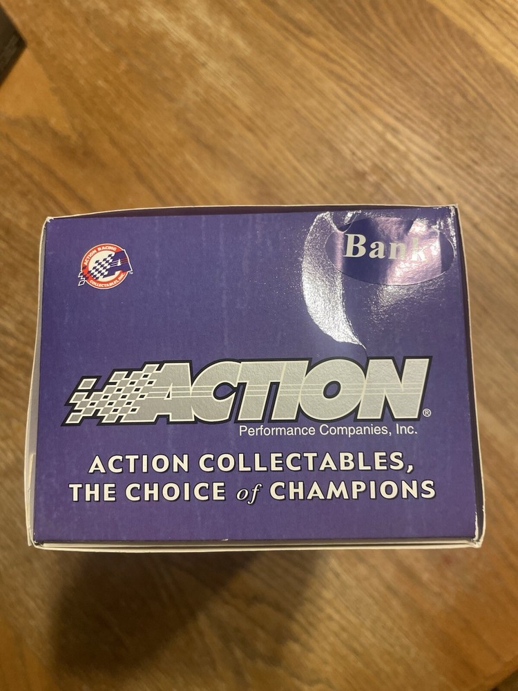 The product is a 1:24 scale diecast model of Jeremy Mayfield's #19 Dodge Dealers Mountain Dew 2002 Dodge Intrepid NASCAR racecar. It is a green-colored replica of the actual racing car driven by Mayfield during the NASCAR races. The model is a bank, which suggests it has a slot for storing coins. Produced by Action, this collectible item is part of the "Cars" character family and is made in China. It is suitable for ages 17 years and up.