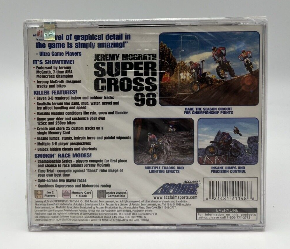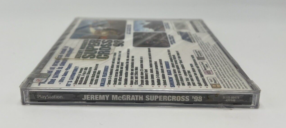 Experience the thrill of high-speed motorcycle racing in Jeremy McGrath Supercross '98 for the Sony PlayStation 1. This game, released in 1998 by Acclaim Sports, lets you take on the role of the legendary rider Jeremy McGrath, competing in various races and challenges across different tracks. With its realistic graphics and engaging gameplay, this racing game is perfect for fans of the genre. Whether you're a hardcore gamer or just looking for some casual fun, Jeremy McGrath Supercross '98 is sure to provide hours of entertainment. 9-3-23
