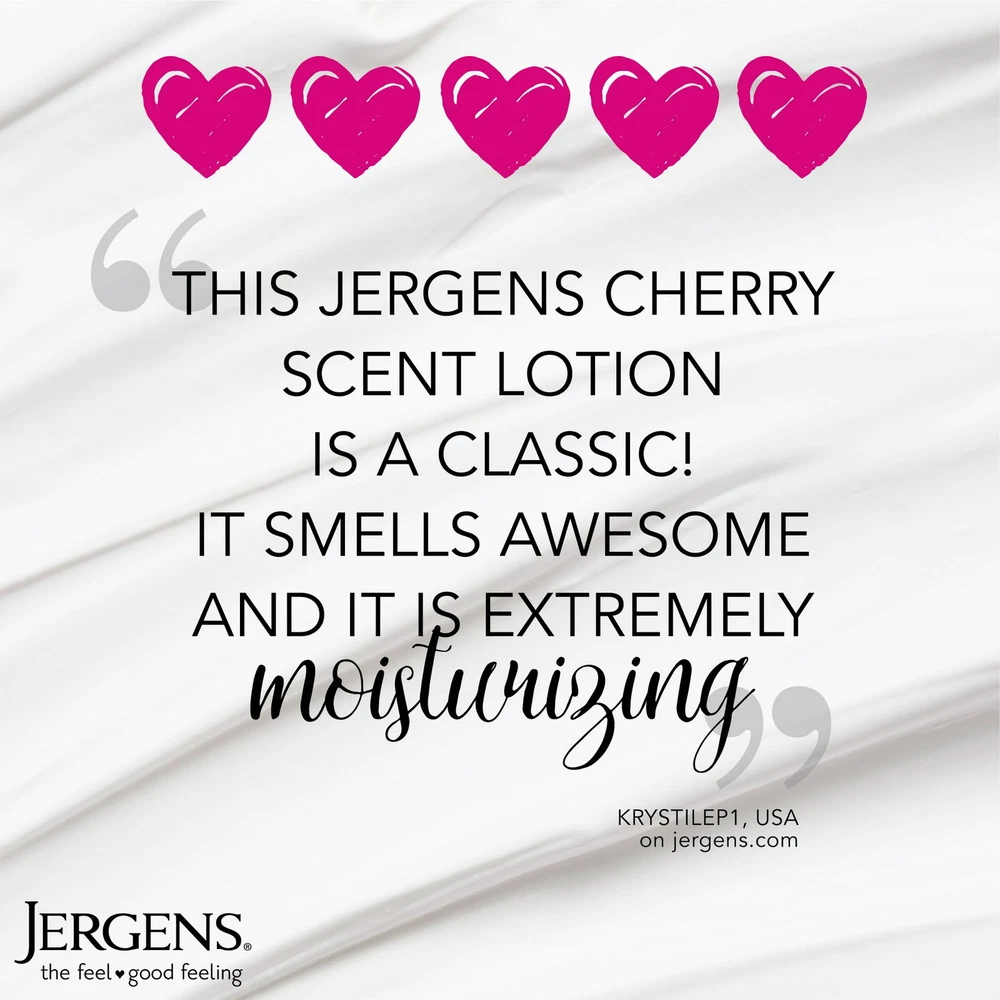 Restore your dry skin with Jergens Original Scent Dry Skin Moisturizer! This body moisturizer is designed for normal to dry skin. Hydrate and restore your skin's luminosity, tone, and texture with Jergens cherry almond lotion. Reveal softer, more radiant skin when you smooth on Jergens Original Scent Dry Skin Body Moisturizer with Cherry Almond Essence. It provides long-lasting, moisture-rich hydration and noticeably softer, smoother skin. Our formula, with a unique Hydralucence blend, nourishing hydrators, and Jergens Cherry Almond essence, leaves skin deeply luminous and lightly scented. The best body lotion for dry skin, this lotion contains nourishing hydrators and cherry almond essence for visibly beautiful skin. With the signature Jergens original scent, this hand and body cream for dry skin is carefully formulated for optimal dry skin relief. Jergens hand and body lotion hydrates and moisturizes dry and cracked skin for extra dry skin relief. As a body lotion, this body cream rejuvenates cracked skin for long lasting hydration and optimal moisture. OUR STORY: Since 1901, Jergens skin care has been the trusted brand for comforting moisture. That’s because everything we do is designed to help you feel good – soothing relief from dryness, a touch of summer color, a fruity scent that makes Monday feel like Friday. We’re not here to stop at skin deep. We’re here to help you feel truly, deeply, skin-to-soul comfortable, with a few surprises along the way. We bottle all that up into the Feel-Good Feeling of Jergens. Satisfaction Guarantee. Limitations may apply. HELPS TO RELIEVE DRY SKIN - Jergens Original Scent Dry Skin Moisturizer provides dry skin with long-lasting, moisture-rich hydration LIGHT FRAGRANCE MOISTURIZER - The iconic Jergens Cherry Almond scent leaves skin lightly fragranced HELPS TO REPAIR DRY SKIN - Jergens Dry Skin Moisturizer helps to restore skin’s luminosity and visibly improve skin’s appearance and texture FORMULATED WITH HYDRATING INGREDIENTS - Combined with Jergens unique HYDRALUCENCE blend, our Dry Skin Moisturizer features nourishing hydrators, and Cherry Almond essence BEST FOR NORMAL TO DRY SKIN - Absorbs into skin for long-lasting hydration