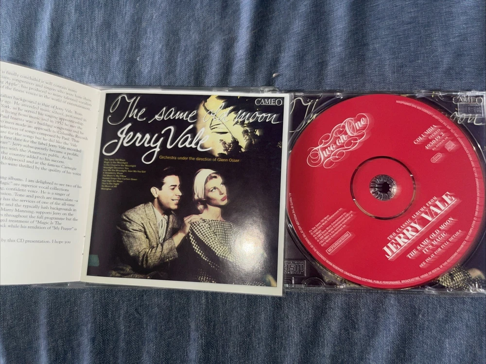 This is a Jerry Vale CD album titled "The Same Old Moon/Its Magic" with a barcode of 5099749304925. The album contains two classic albums in one CD and features vocal and traditional/vocal styles. The album is perfect for various occasions such as Christmas, New Year, birthday, and wedding. The CD is in mint condition and comes with a jewel case, original inner sleeve, and original cover. The album is produced by Jerry Vale and is in English language. CHEAPEST PRICE ON EBAY!!!