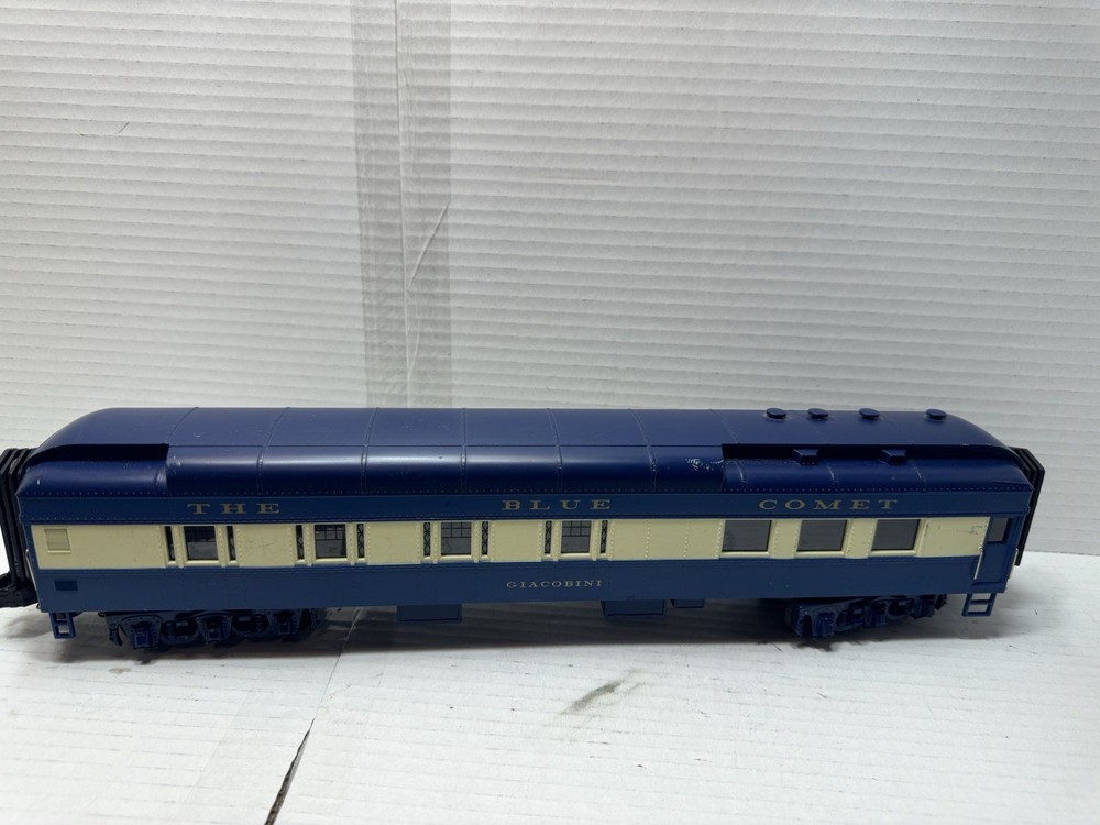 Railking o gauge jersey Central 60 foot Madison coach car the blue comet. Comes in original box box does have somewhere from storage. Car was used at a convention and fell off the track. Please see pictures. There is some scratches on the roof side. Also, the back of the car cushioning walkway rubber has gotten torn not sure how. Otherwise car is in good condition. If you have any questions, please feel free to message me. Thank you and have a good day.