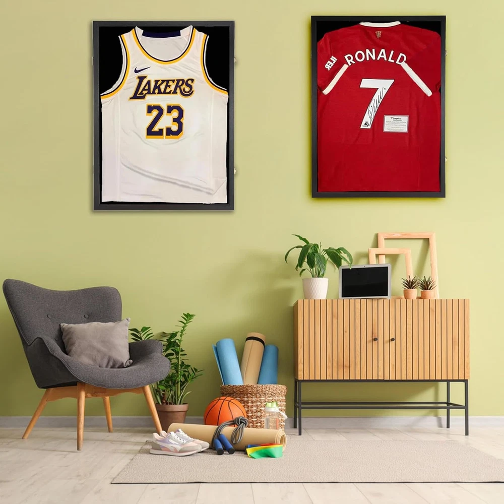 Engineered Wood One Size Fits All- Large size display frame of 31.25" x 23.25" x 1.5" fits most sports jerseys,Make it a perfect gift for sports fans! It can also be used as a shadow box to display military uniform, graduation memorabilia and other cherish memories. Three Ways To Display-Two style wooden hangers is perfect for hanging your sleeveless commemorative jersey. The Pin board is great for stretching out your short or long-sleeved jersey.(Note:Jersey not include) Multi-Function Display Case- You can display your Hockey Baseball Basketball Football Soccer Tennis Marathon Sport Shirt,or military uniform,t-shirt,baby souvenir clothes,graduation memorabilia and other cherish memories. Great Gift Ideal For Sport Lovers-Football jersey frame really a great gift for jersey enthusiast to well display their t-shirt and Collector Autograph jersey and show them to their family and friends. And it is also a stylish decoration for home and office.Jersey display frame can be a gift for Christmas, Valentine's Day, Thanksgiving, Veterans Day. PROTECT COLLECTIBLES-jersey frames won't turn yellow over time and always offer ultra clear viewing.One size fits all sports jersey of baseball, basketball,football,soccer,hockey,jerseys. The large show box can display flag,uniforms, graduates items, sports souvenirs,collectibles and memorabilia. Product description