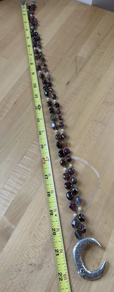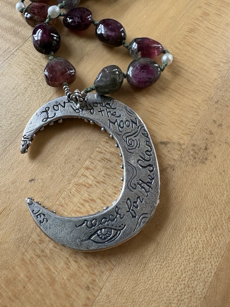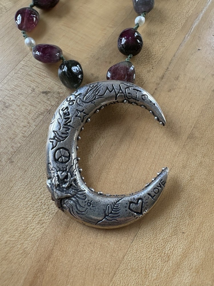 The Jes Maharry Silver Necklace with Purple Gemstones and Huge Moon Pendant is a stunning accessory perfect for women. Made with natural purple gemstones set in silver, this necklace features a bezel setting and a charm pendant. Signed by the brand, this unique piece is sure to make a statement with its bold design and vibrant colors. Made in the United States, this necklace is a piece of jewelry that combines elegance and style effortlessly.