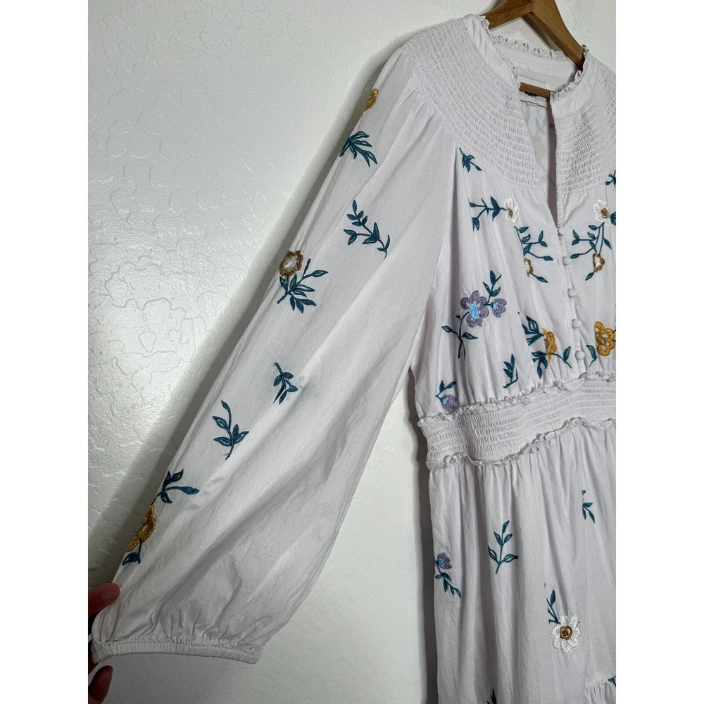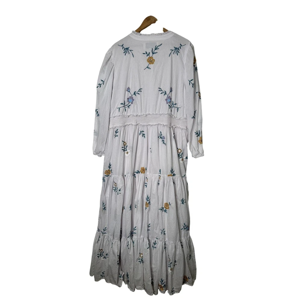 Jessakae Womens Long Sleeve Maxi Floral Embroidery White Dress Cotton India Made Lined 24" Pit to Pit