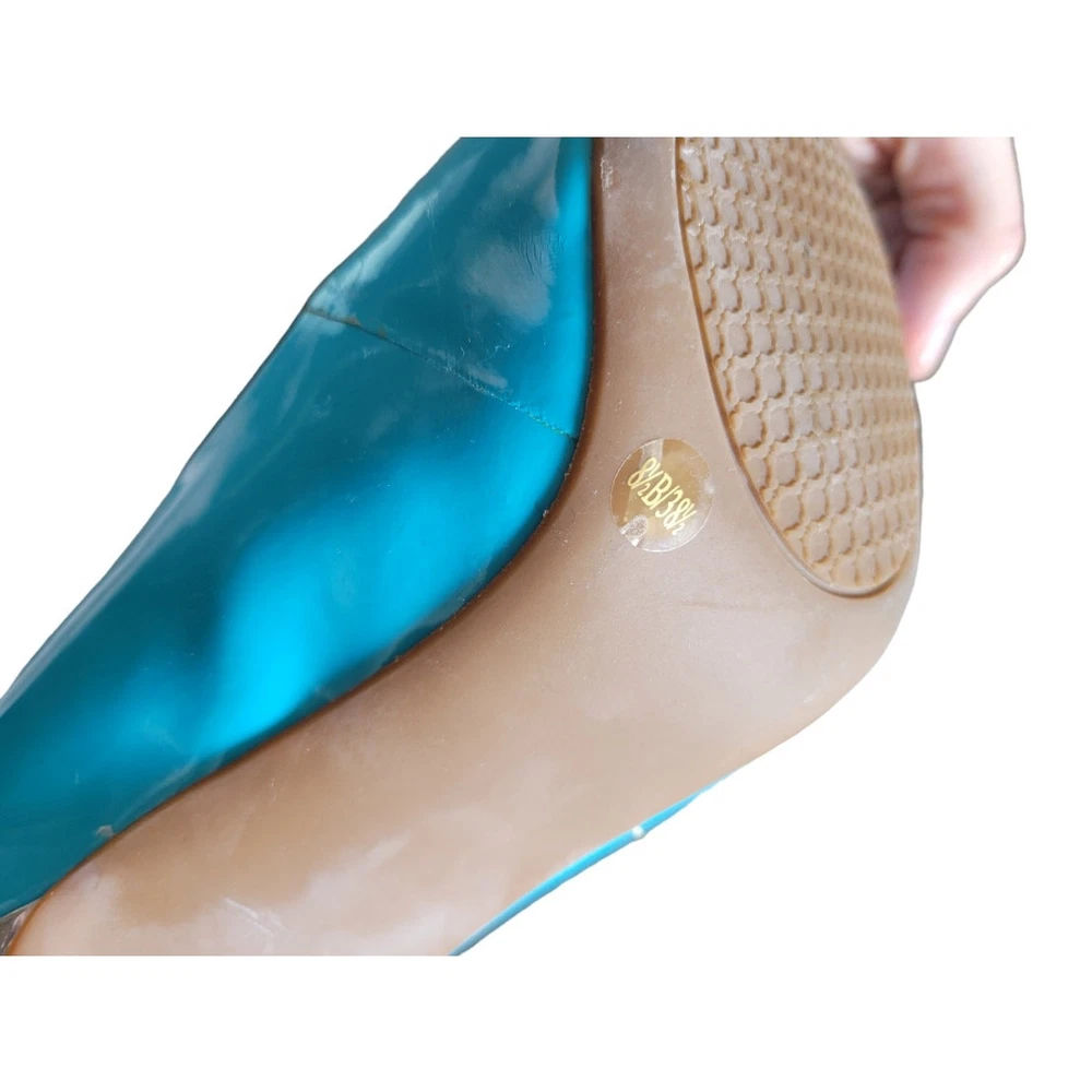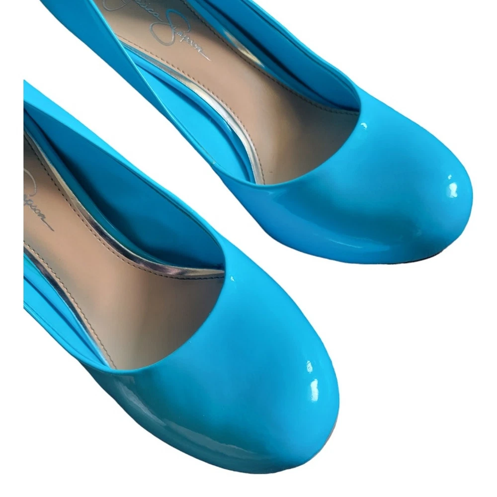 These Jessica Simpson heels feature a vibrant Capri Blue color in a patent finish, with a slip-on style and a round toe design. The ultra-high stiletto heel adds a touch of glamour to the pump silhouette, making them a stylish choice for any fashion-forward woman. Perfect for adding a pop of color to any outfit, these heels are a statement piece that exudes confidence and sophistication. NEW Jessica Simpson Patent Slip On Heels Round Toe Teal Blue Size 8.5 New in box Brand: Jessica Simpson Size: 8.5 New in box Round Toe Slip-on 4 inch heel