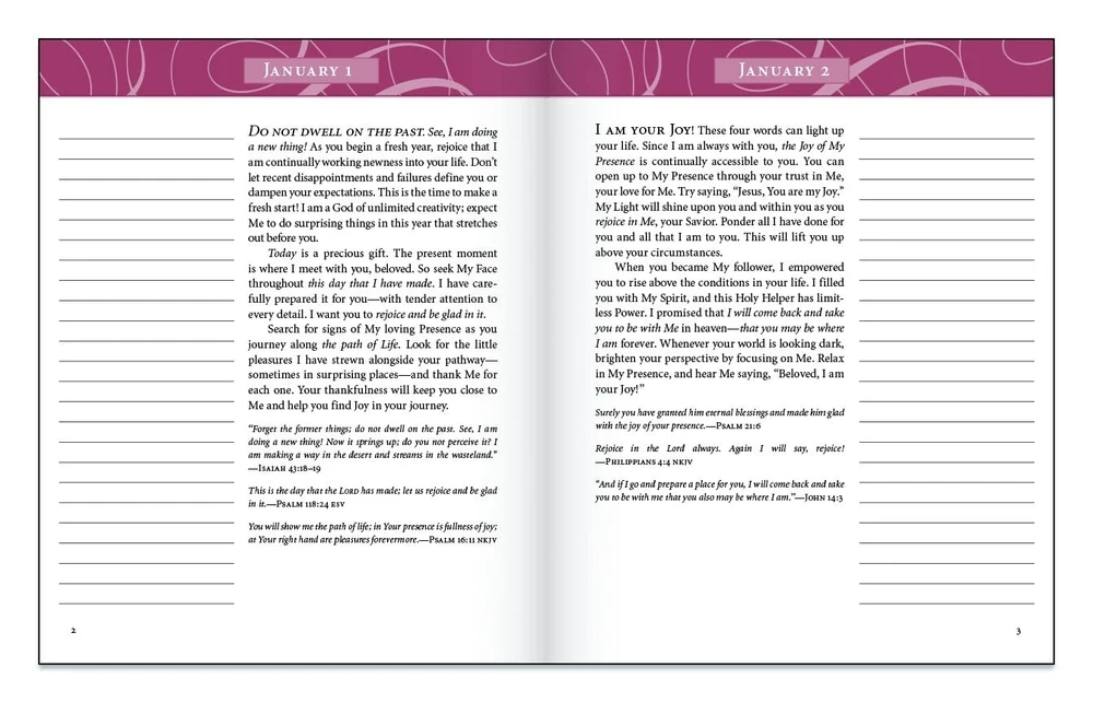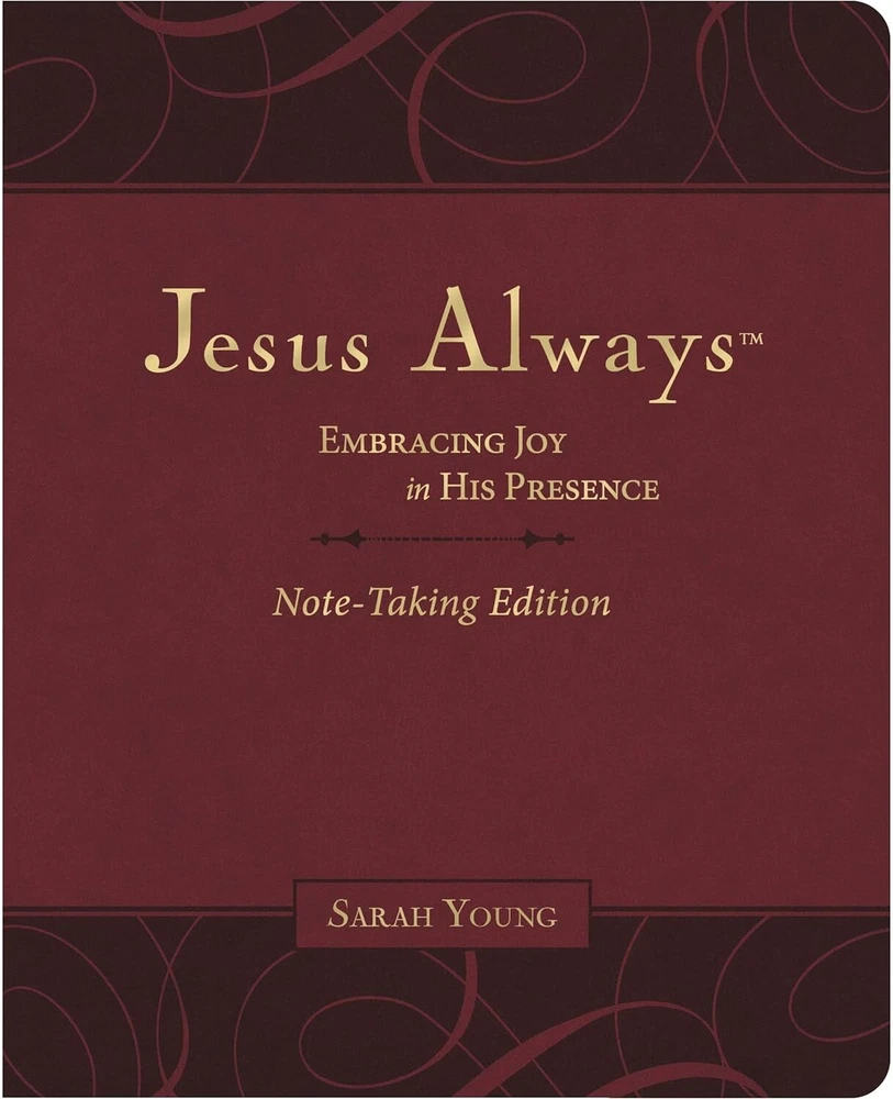 Experience joy in Sarah Young's 365-day devotional, Jesus Always . This note-taking version with space to record reflections, list blessings you're thankful for, or delve more deeply into the devotional message, shares the biblical teaching of joy in the same way Jesus Calling shared the peace of God's presence. Life today is full of difficulties—loss, sadness, fear. In the midst of these challenges, joy often feels impossible or out of reach. But Jesus offers hope and contentment in the midst of pain and uncertainty. Jesus Always Note-Taking Edition includes: Written-out Scriptures A beautiful two-color interior and Leathersoft cover 365 days of Bible-based devotions Space on each page to write your personal reflections A ribbon marker to hold your place Draw near to Him with Jesus Always , and you will discover how to: Intimately and gently connect with Jesus—the One who meets you where you are Identify joy-filled reminders from the Word of God Process challenging situations, anxiety, and loss with a hopeful outlook Strengthen your faith and create a deeper bond with Jesus Written as if Jesus Himself is speaking directly to you, Jesus Always invites you into a new way of living—a life of joy. Whether you gift Jesus Always Note-Taking Edition or pick it up yourself, Sarah Young's words and her constant return to the Word of God will enrich your devotional life like never before. This special edition is sure to be a favorite. The cover has deluxe touches, giving a classic feel, and inside you'll find written-out Scripture verses and journaling space.