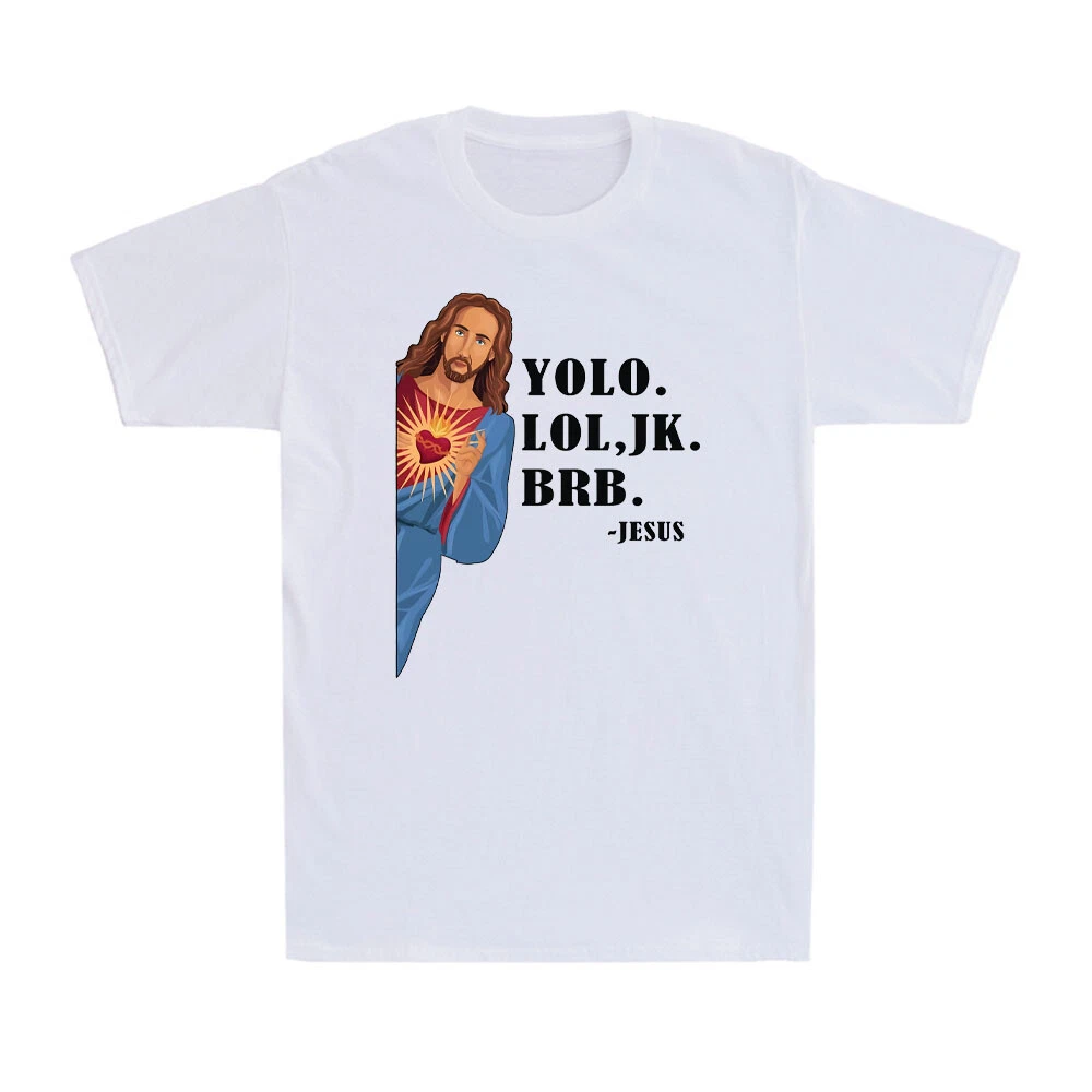 Jesus Yolo LOL JK BRB Funny Jesus Christian Religious Humor Meme Men's T-Shirt Our products are 100% cotton garments and satisfaction is guaranteed. All our garments are comfortable, top quality apparel. Shipment : All shipments will be provided a tracking number Orders are fulfilled in 2 business day Detail Size: Chest Length Sleeve XS 94CM / 37" 66CM / 26" 18.5CM / 7.3" S 100CM / 39.5" 68CM / 27.1" 19.5CM / 7.7" M 105.5CM / 41.5" 72CM / 28.4" 19.5CM / 7.7" L 110.5CM / 43.5" 74CM / 29.1" 20CM / 7.9" XL 115.5CM / 45.5" 76CM / 30" 20.5CM / 8.1" XXL 120.5CM / 47.5" 79CM / 31.1" 20.5CM / 8.1" XXXL 128CM / 50.4" 83CM / 32.6" 21.5CM / 8.5" XXXXL 140CM / 55.1" 85CM / 33.5" 21.5CM / 8.5" Shipment : All shipments will be provided a tracking number Orders are fulfilled in 2 business day You may pick from the following shipping options: USA Standard SpeedPAK: 7-14 business days delivery Expedited Shipping: 3-5 business days delivery Worldwide 10-24 business days delivery Payment: We accept Paypal where you can use all major credit cards. This item requires immediate payment. Your product will begin production immediately. If you require any adjustments to your order, please let us know right away.