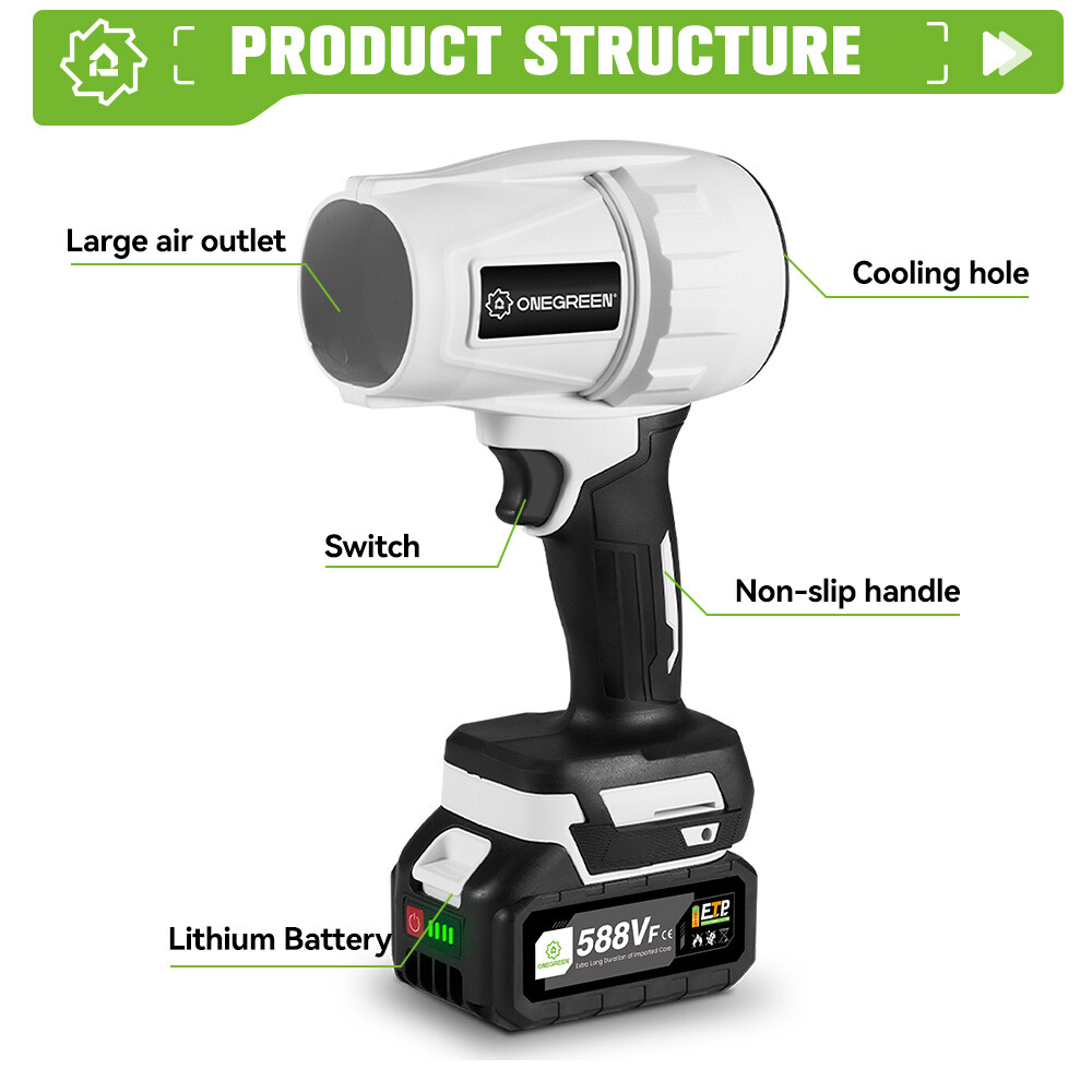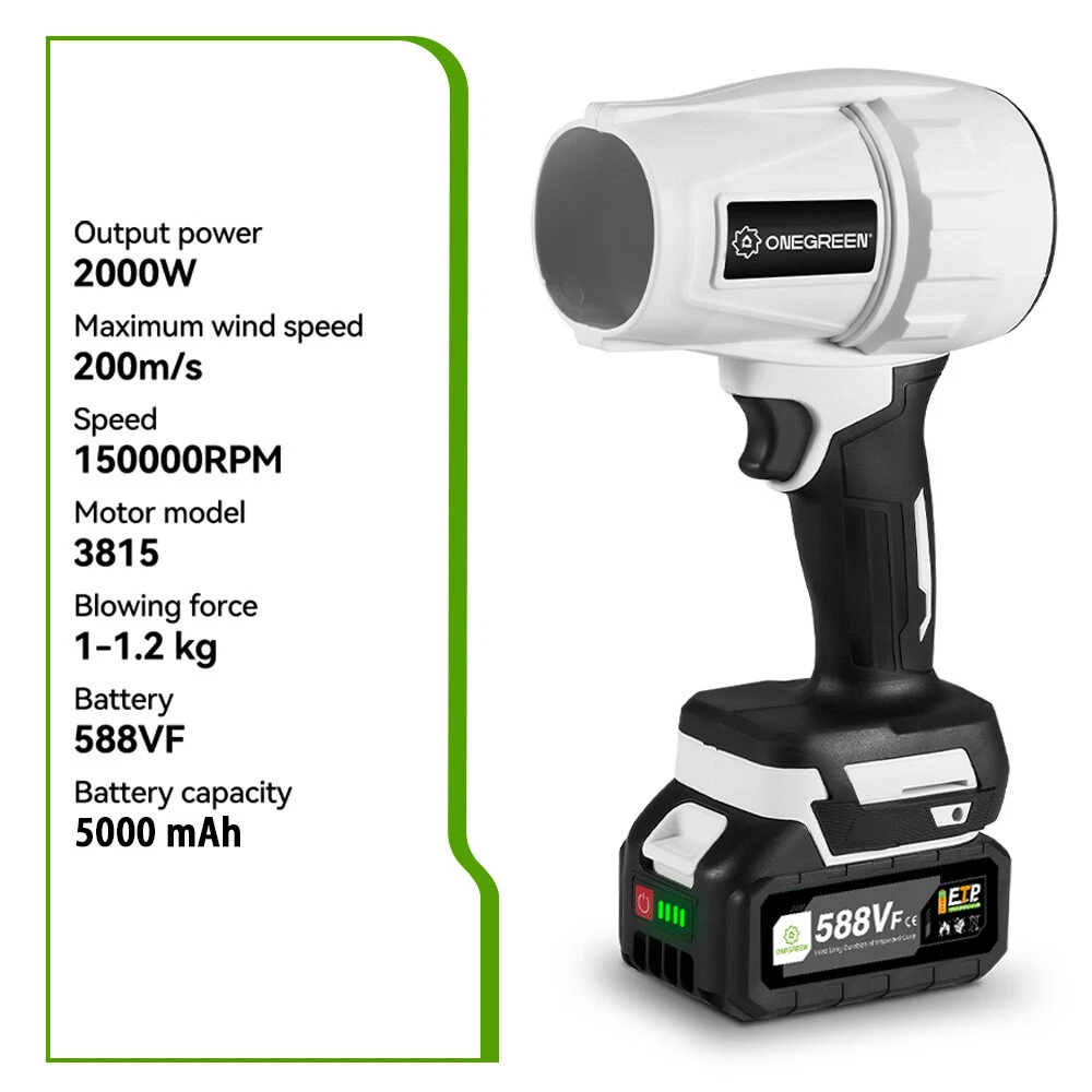 Cable Length: Cordless UPC: Does not apply Material: Aluminum, Metal, Plastic Type: Mini Turbo Jet Blower Color: White Power Source: Battery, Charger Room: Any Room Maximum wind speed: 200m/s Power: 2000 W Voltage: 21 V Features: High Velocity, Rechargeable, air, clean, cleaning, cool, dust, duster, Portable, Powerful Motor: Brushless Speed: 150000 rpm Brand: ONEGREEN gtin13: Does not apply