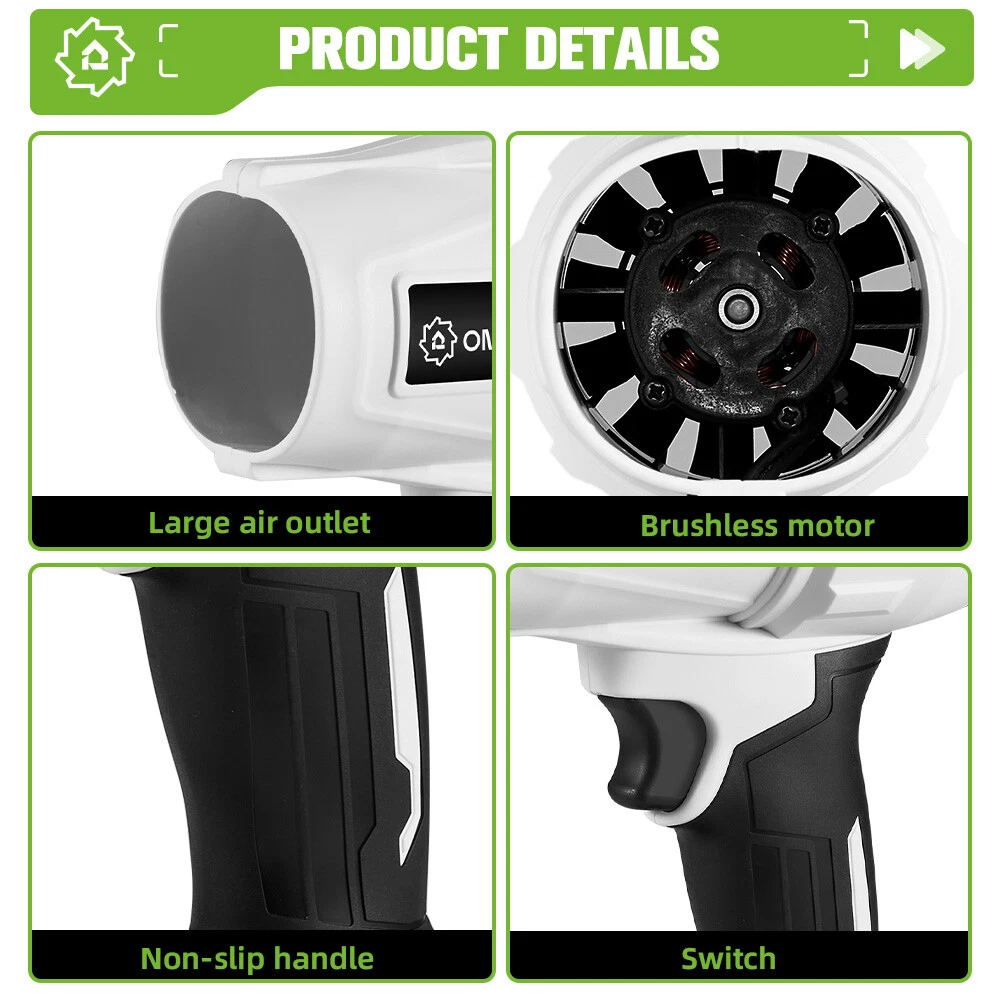 Store Categories Store Categories Impact Wrench Power Tools Other Welcome To Our Store Product Description Features: 【Turbo blower 】- Cordless leaf blower reaches an impressive wind speed of 200 m/s (720 km/h), ideal for efficiently cleaning leaves, snow and dust. 【2500W brushless motor for maximum efficiency】 - With 150,000 rpm and a blowing power of 1-1.2 kg, our cordless leaf blower offers exceptional performance with low maintenance. 【Stepless speed control】 - Adjust the power of the air blower precisely to any task, from gently dusting delicate surfaces to powerfully removing stubborn dirt. 【Cordless and portable】 - Weighing just 0.82 kg, our cordless leaf blower offers unrestricted freedom of movement. Equipped with 2*5.0Ah upg raded lithium batteries that provide you with continuous power. 【Versatile】 - whether as a cordless snow blower for your car, a cordless dust blower in the workshop or a powerful cordless leaf blower in the garden - this all-rounder masters every challenge with ease. Specifications: Power: 2000W Maximum wind speed: 200m/s Speed: 150,000 rpm Blowing force: 0.5 kg Number of batteries: 2 Batteries Capacity: 5000 mAh Motor: Brushless Package includes: 1 x turbo blower 1 x US charger 2 x batteries Please know before placing an order: Our power tools are compatible for Makita 18V batteries, this does not mean that it is an original product. Compatible for Makita 18V Battery: (Refers that our machines are compatible with the following battery models.) √ Compatible for 18V B series lithium batter y, such as BL1850B (197285-8), BL1840B (197270-1), BL1830B (197602-2), BL1430B (197618-7), BL1820B (197487-6) √ Compatible for BL1850, BL1840, BL1440(196391-6), BL1415(194560-3), BL1815N(196781-3) Payment Policy Shipping Policy Returns Policy Tems of sales Payment Policy 1. We accept PayPal only. 2. All major credit cards are accepted through secure payment processor PayPal. 3. Payment must be received within 7 business days of auction closing. 4. We ship to your eBay or Paypal address. Please make sure your eBay and Paypal address is correct before you pay. Shipping Policy 1. We ship to your eBay or Paypal address. Please make sure your eBay and Paypal address is correct before you pay. 2. Items will be shipped within 1-3 business day when we received payment. 3. Delivery time depends on destination and other factors; 4. International buyers please note: a.Import duties, taxes and charges are not included in the item price or shipping charges. These charges are buyer’s responsibility. We will try our best to reduce the risk of the custom duties. b.Please check with your country's customs office to determine what these additional costs will be prior to buying. Returns Policy 30-day returns. Buyer pays return postage Tems of sales 1. If you are satisfied, we sincerely hope that you can leave us a positive feedback and 5-star Detailed Seller Ratings, which are of vital importance to the growth of our company. 2. Besides, PLEASE DO NOT leave us 1, 2, 3 or 4-star Detailed Seller Ratings because they are EQUAL TO negative feedback. Like we said before, if you have any questions, please contact us first coz disagreement cannot settle problems. We really appreciate your support! 3. We Strive for Five Star 5/5 detailed rating positive feedback. If for any reason you are not satisfied please give us the opportunity to resolve the issue before leaving feedback or opening a dispute on Paypal or Ebay. Thank you! Copyright © 2023 Dianxiaomi