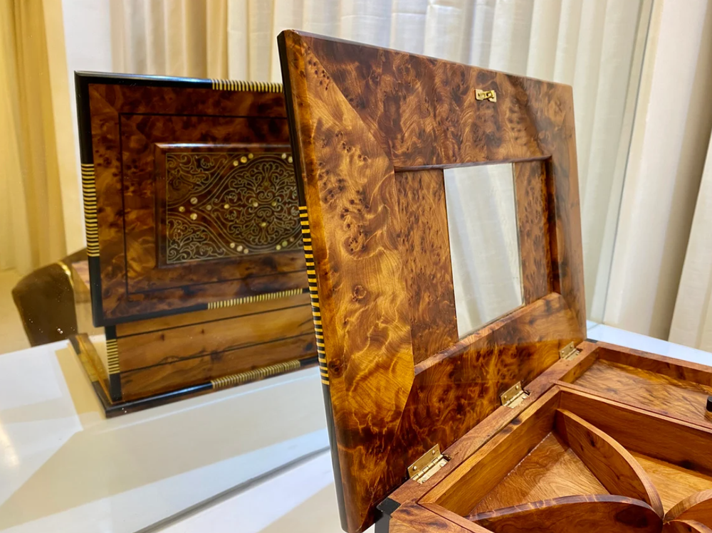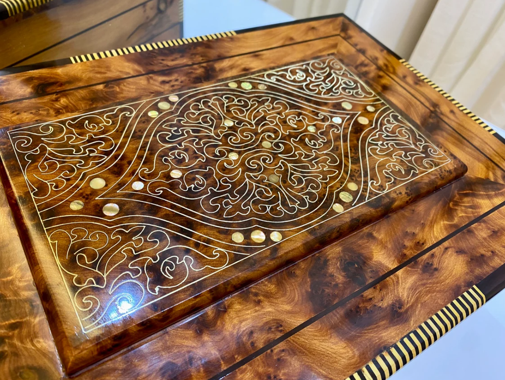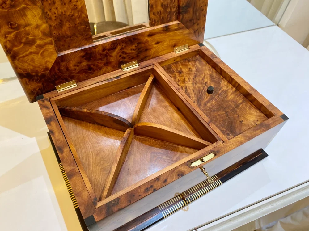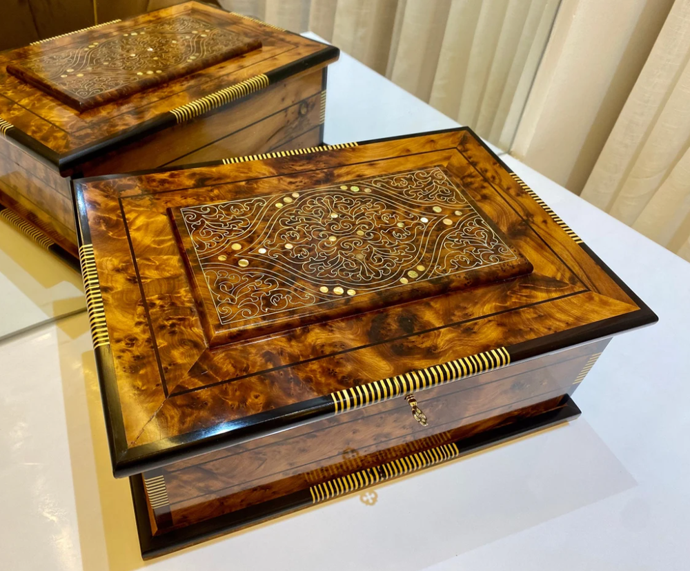 Discover an artistic way to keep your precious items safe and elegantly displayed with the AtlasPerles Jewellery Box. Handcrafted with love by the Maalem, an artisan master, this box combines deep-rooted color, a concentrated aroma, and a fascinating grain to add a perfect touch of artistry to your room decor. Key Features: Unique Craftsmanship: Handmade by Moroccan artisans using skills passed down for over a hundred years. Premium Material: Made from rare Thuya wood found exclusively in the Atlas Mountains of Morocco. Elegant Design: Features large storage space, a removable divider, and a lockable box with a brass key. Intricate Inlays: Decorated with mother of pearls, cedar, and walnut wood. Perfect Gift: Ideal for birthdays, anniversaries, or weddings, this box is a unique gift for him and her. It’s eco-friendly and does not cause environmental damage. Customization: We accept custom orders for engraving/printing text on the lid and offer leather or velvet inside wrapping. Product Specifications: Dimensions: Length: 33 cm - 13 inches Width: 21 cm - 8 inches Height: 12 cm - 4.7 inches Shipping Details: Processing Time: It takes 1 day to ship your order after receiving it. Delivery Time: 3-5 business days using express shipping. Satisfaction Guaranteed: If you're not happy for any reason with our box, feel free to return it. Contact Us: For any information or questions, feel free to contact us, and we will reply as soon as possible.