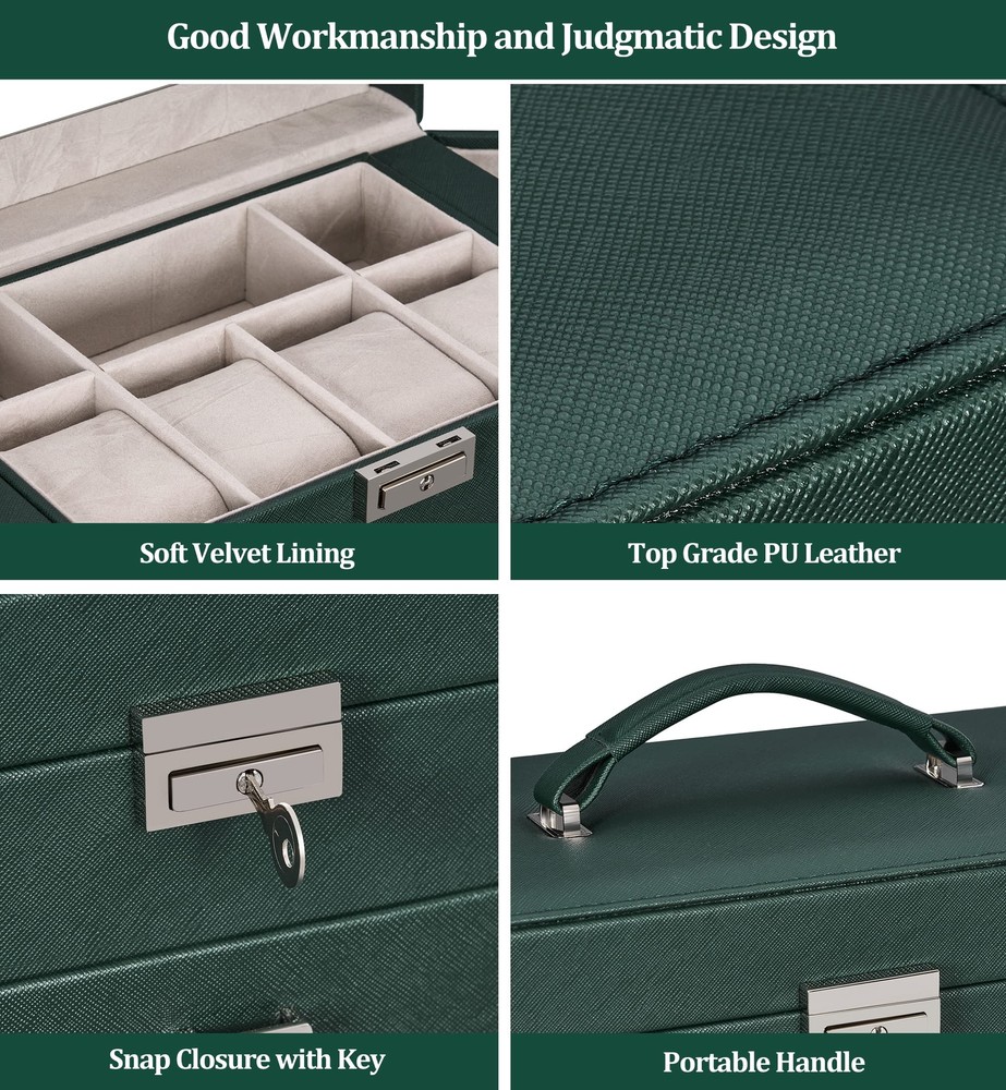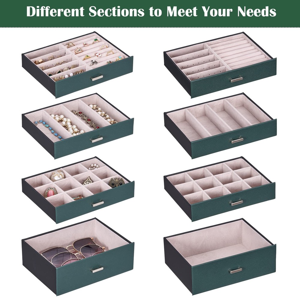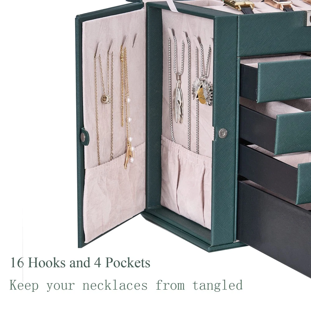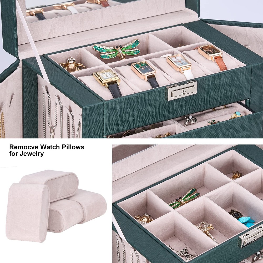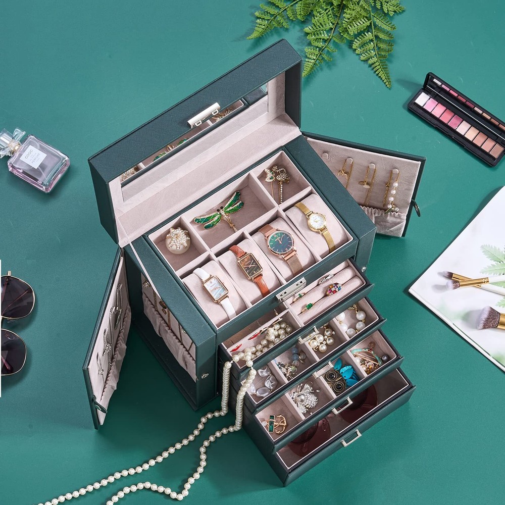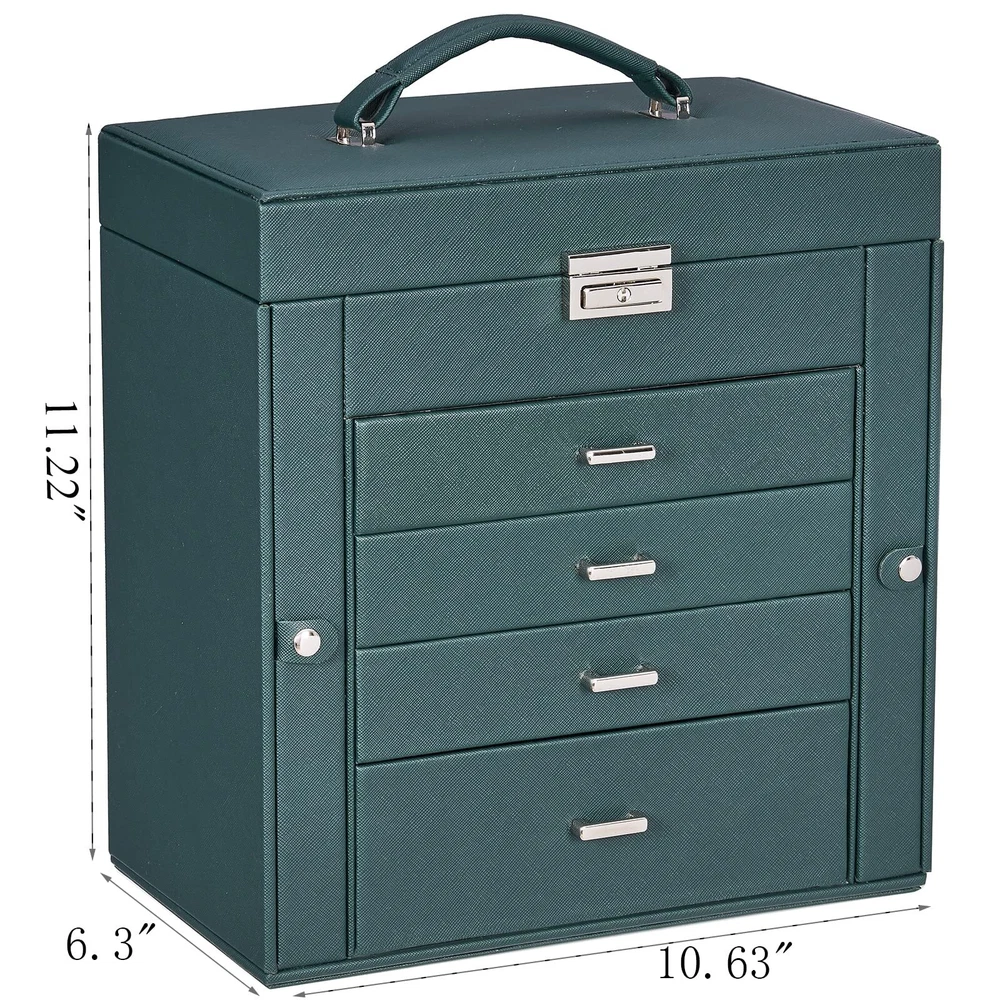 LARGE CAPACITY JEWELRY BOX:5-tier and 2-wings can organize all your jewelry. The top layer with lock and mirror to valuable jewellery. Contains 4 pillows, 4 earring grids and 7 ring cushions, 12 equal-sized squares, large sunglasses grid. The middle 3 layers can be interchanged MULTI-FUNCTIONAL JEWELRY ORGANIZER:The jewelry box It can be put a couple watches, earrings, rings, necklaces, hairpins,brooches, bracelets, and some sunglasses distributed into all the drawers. Avoid jewelry tangle and loss and tarnish in the air, keep your desktop neat and clean STURDY and ELEGANT for WOMEN:The jewelry box frame is made of medium density fiberboard, the structure is stable and will not dent or fall apart. The exterior is Faux Leather, which can be cleaned with a damp cloth without cracks or peeling. The interior soft velvet lining can protect your jewelry from scratches.Elegant and suitable for women of all ages JEWELRY ORGANIZER BOX with LOCK and MIRROR: Intimate and convenient. You can save your precious jewelry box in the lockable grid to prevent loss and trouble. The mirror on the top layer is convenient for you to choose the right jewelry to match your makeup, and find the objects you want more quickly GIFTABLE-BEAUTIFULLY CRAFTED:The jewelry box exquisite workmanship and exquisite hardware. For GF, MOM and daughter, it is a good choice for Valentine's Day, Mother's Day, birthday or Christmas SMALL FOOTPRINT: 10.67" L x 11.30" H x 6.22 W, It can be placed on your dressing table or vanity, it will not take up a ton of space