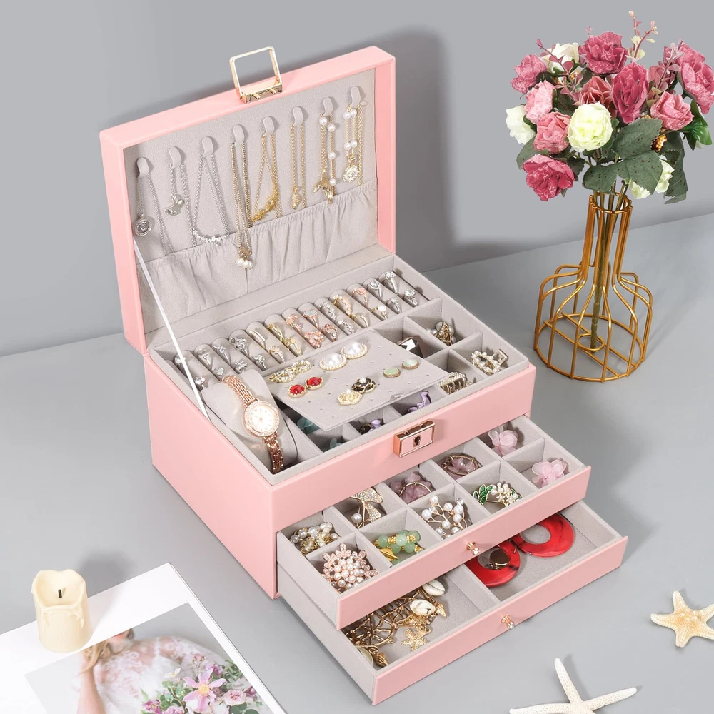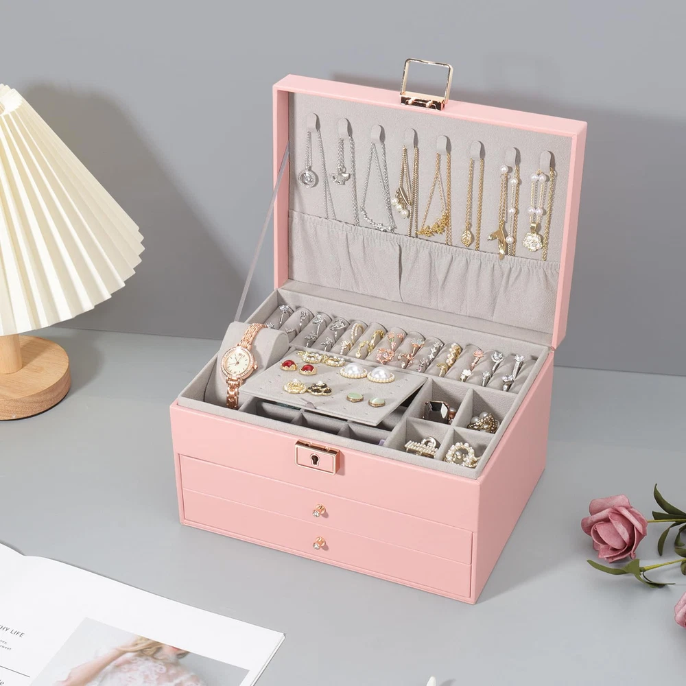 Jewelry Box, Jewelry Organizer with 2 Drawers, 3 Layers Leather Jewelry Stora...