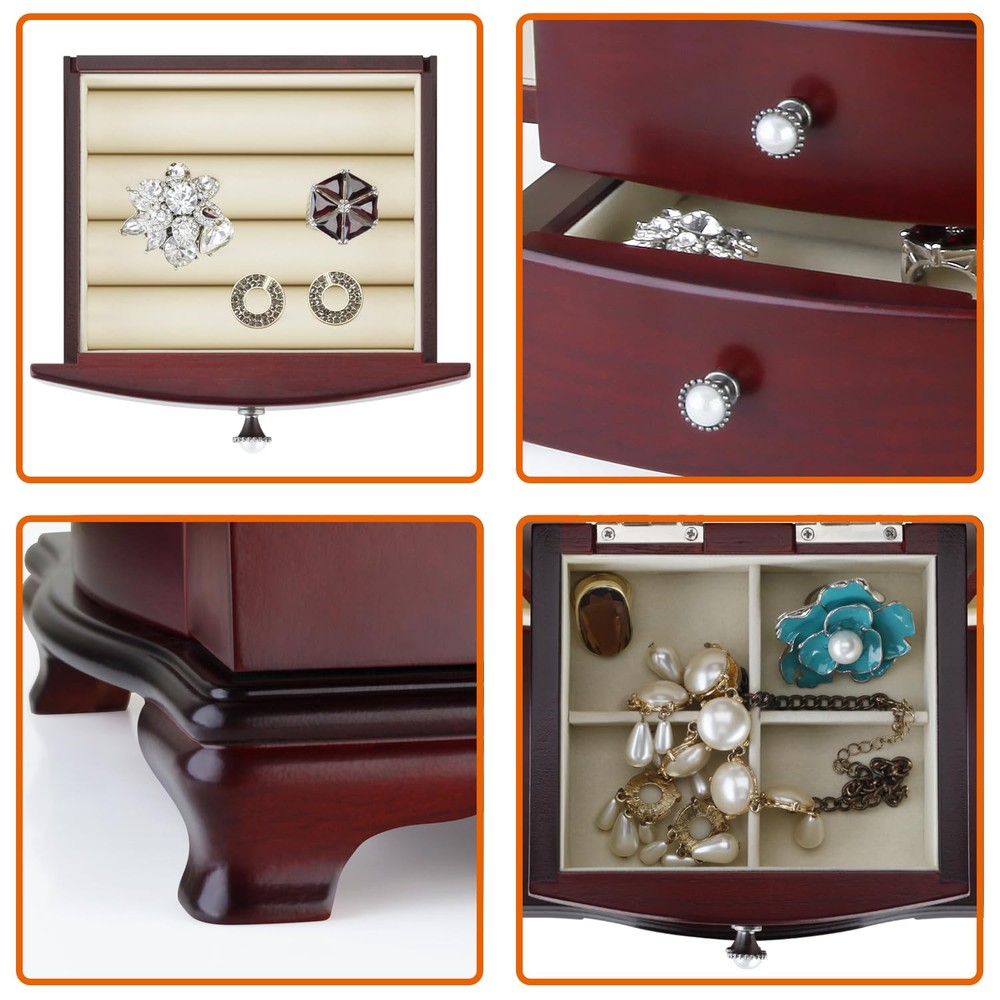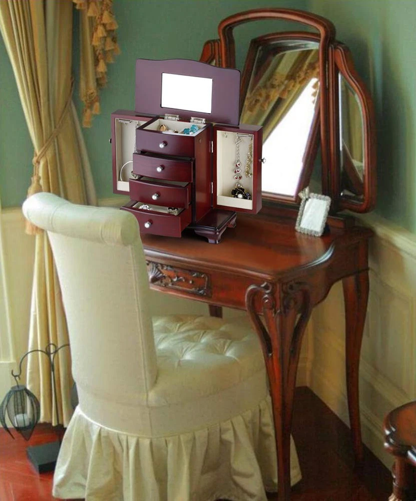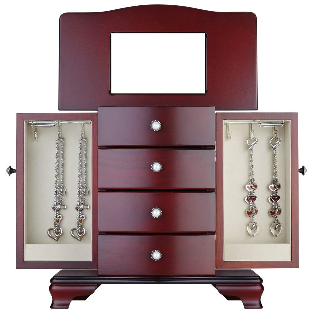 THE ROUND RICH HIGH-GRADE JEWELRY BOX:High-end natural hardwood structure, Anti-Tarnishing velvet lining, exquisite hardware decoration, harmonious color match, highlighting taste and nobility. Packaged in a beautiful GIFT BOX, a gift that women will not refuse! Exterior design: Streamlined top design, classic heavy foundation, double Necklace door and beautiful pearl door handle and drawer handle provide timeless style and ingenious convenience. Four story tower and large storage space with separate open doors on both sides. Three large detachable drawers and a customized ring drawer, this multifunctional jewelry box is not only exquisite, but also luxurious. Internal Multifunctional Design:3 removable square drawer on the middle, large space storage (It can store necklaces, bracelets, earrings, earpins, hairpins, watches, rings and other jewellery accessories). Large cosmetic mirrors are fitted on top, making it easier to choose jewelry to match your own clothes; 6 Necklace hooks on the top of the doors hung both sides of the open storage space, which can hang a variety of jewlery, and multilayer velvet ring storage device in the bottom drawer. Size:Jewellery box 10.2" x 5.7" x 10"(L*W*H); Drawer Internal Space 4.3 x 3.5, Deep 1.5"; Mirror Size: 3.2" x 4.8". This elaborate jewelry box will protect all your accessories from scratches and offers a clean storage environment for jewelry. Perfect gift for girlfriend. No reason refund. Click and add to cart now.