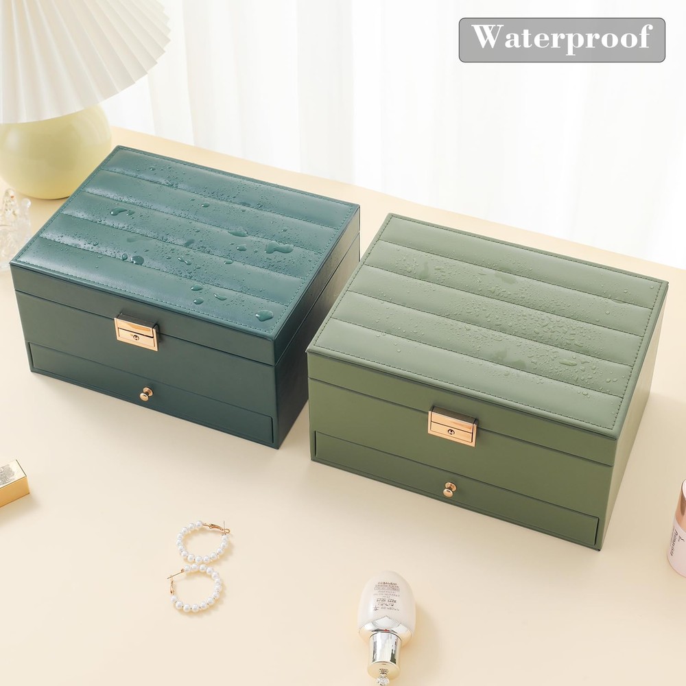 Material: Jewelry storage box made with High quality Faux Leather, velvet lining provides good care for your gems,durable and dirt-resistant,waterproof, non-deformable,metal buckle easy to opening and closing,keep your jewelry ready to wear and clean Capacity: The large jewelry organizer has 3 layers, 9 rings slots, 54 ear stud holes, 2 watches slots, 4 bracelet slots, 20 slots with 1 drawer for other accessories,made a new upgrade on the basic of the original Jewelry Box Organizer Size: 23x17.5x12.5cm(9"x6.89"x4.92" IN),weight: 1.76 lbs,storage organizer is enlarged,convenience for you to collect different types of jewelry,do not need to waist any extra time to find lost jewelry Meaningful Gifts: Exquisite design and elegant craftsmanship jewelry box is a perfect gifts for women, speical occasion like Valentine's Day, Mother's Day, Thanksgiving Day, Christmas and Wedding, Birthday, Anniversary, unique and sweetful Display Your Charms:Jewelry boxes for women will be separated and untangled your jewelry, top lid with 8 hook for your necklace and pandent,elastic shirred catch pouch keeps pandent neat and stay in place,top drawer for watches, bracelet, earring and rings collect, easy to find and catched your need moment time,Third layer boasts a specially designated area for your precious jewelry pieces, ensuring easy access and perfect storage