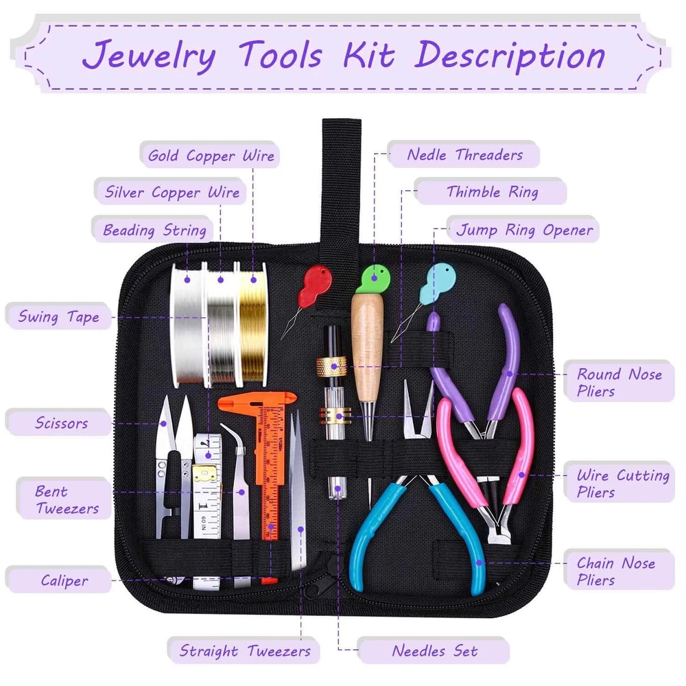 Please Note : If the pliers you received have some oil on the head that make it look like dirty, please do not be worry. The jewelry pliers are coated with oil to prevent rust. Please wipe them clean with a cloth before use and apply oil to them before storage, which will help the pliers keep anti-rust. Package included: 20Pcs jewelry making tools: - 1 pair of Round nose plier - 1 pair of Wire cutting plier - 1 pair of Chain nose pliers - 6 pieces different length beading needles - 1 piece of awl - 1 piece of caliper - 1 piece of soft tape measure - 1 pair of thread scissors - 2 pairs of tweezers - 1 piece of jump ring opener ring - 1 piece of thimble ring - 3 pieces of needle threaders - 1 piece of adjustable helping hands 6 rolls of beading wires: - 1 roll of 0.4mm silver beading wire/ bracelet wire - 1 roll of 0.4mm gold beading wire/ bracelet wire - 1 roll 0.8mm crystal beading thread string - 1 roll 1.5mm black waxed necklace cord - 1 roll 1.5mm silver necklace plated chain - 1 roll 1.5mm gold necklace plated chain 1830Pcs jewelry findings in silver and gold: - 400 * 4 mm open jump rings - 300 * 5 mm open jump rings - 200 * 6 mm open jump rings - 100 *8 mm open jump rings - 40 * lobster clasps - 60 * eye pins - 60 * screw eye pins - 400 * crimp beads - 40 * earring hooks - 40 * ribbon ends - 60 * cord ends - 100 * 4mm rubber earring back - 30 * 10mm rubber earring back 100Pcs jewelry making charms: - 100 * tibetan silver metal charms pendants 【Include All You Need】jewelry making supplies kit includes 3 jewelry pliers, 2 rolls of copper wire, 1 string cord, 1 black waxed cord, 2 rolls of necklace chain, 6 needles, 2 tweezers, 1 caliper, 1 awl, 1 jump ring opener, 1 thimble ring, 1 thread scissors, 1 tape measure, 3 needle threaders, 100 tibetan silver metal charms pendants, 1830Pcs jewelry findings, Including the basic tools and findings you need for most projects for earring making, necklace repair and bracelet fix 【Superior Beading Pliers】The jewelry making tools kit has 3 necessary jewelry pliers: round nose plier, wire cutting plier and chain nose plier. Each plier has double leaf spring and non-slip handles which make them effective and safe for use 【Various Types of Jewelry Making Accessories】Totally 1830 pieces different styles of jewelry findings include open jump rings (4mm, 5mm, 6mm, 8mm), lobster clasps, eye pins, screw eye pins, crimp beads, earring hooks, ribbon ends, cord ends and rubber earring back 【Exquisite and classical design charms】The jewelry repair kit comes with 100pcs silver metal charms in different patterns, which makes jewelry making and charm necklace bracelet making creative. Perfect for necklace, bracelet, dangle, scrapbooking project, keychain, keyring, sweater chain, anklet, cellphone decorative accessories, etc. Best choice for jewelry DIY 【Easy Organized】The jewelry making kit comes with a premium black zip pouch and a plastic compartment box, so you can keep your tools and findings handy, organize and safe, and no worry about losing tools or accessories
