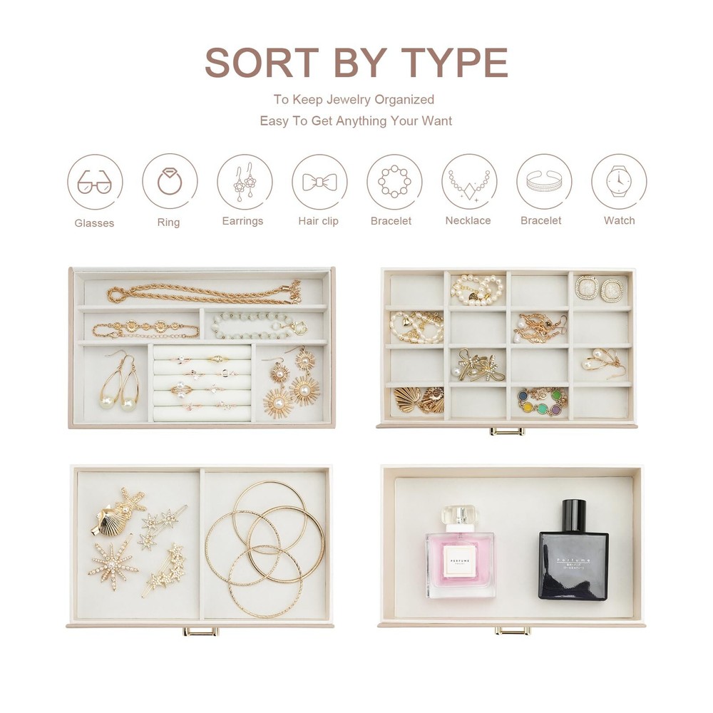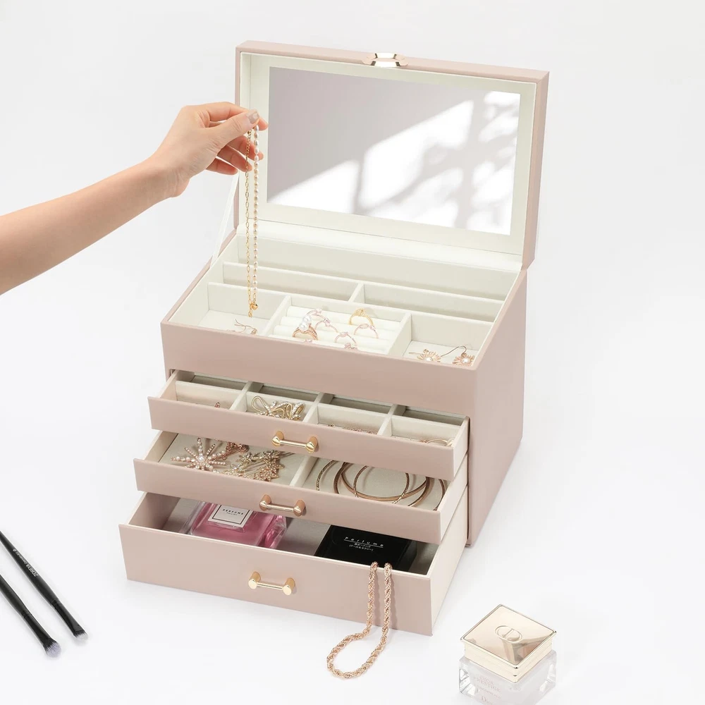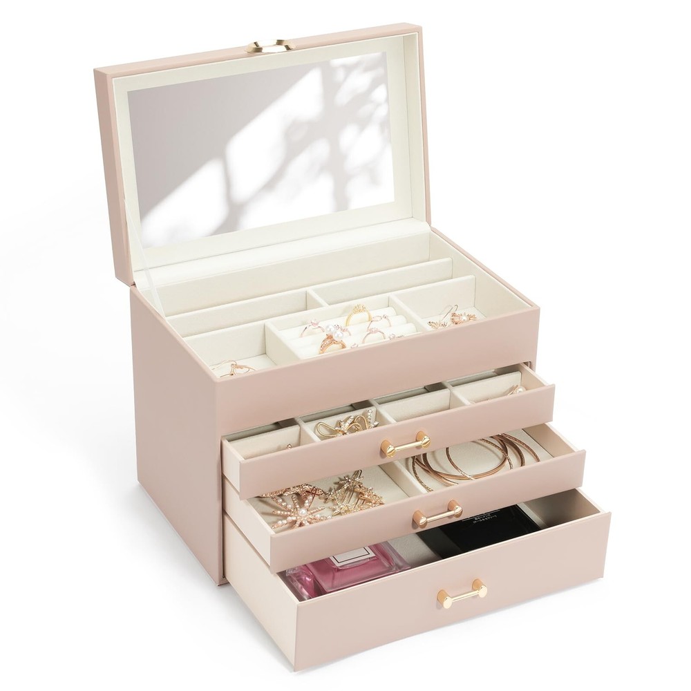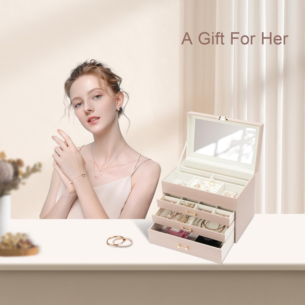 Jewelry Organizer Box with Mirror, Large Jewelry Organizers and Storage, Jewelry Boxes for Women, Jewelry Organizer 4-Layer Jewelry Display Case, Apricot Mirror Product Details Color: Mirror Apicot Brand: V-LAFUY MPN: Does not apply UPC: Does not apply EAN: Does not apply Color: Mirror Apicot Brand: V-LAFUY Material: Leather Style: Modern Special Feature: Portable, Lockable Recommended Uses For Product: Necklace, Bracelet, Ring, Earring Product Dimensions: 9.84"D x 7.09"W x 6.1"H Target Audience: Women Shape: Rectangular Occasion: Wedding, New Home, Thanksgiving, Memorial Day, Valentine's Day Color: Mirror Apicot Brand: V-LAFUY Material: Leather Style: Modern Special Feature: Portable, Lockable Recommended Uses For Product: Necklace, Bracelet, Ring, Earring Product Dimensions: 9.84"D x 7.09"W x 6.1"H Target Audience: Women Shape: Rectangular Occasion: Wedding, New Home, Thanksgiving, Memorial Day, Valentine's Day Mounting Type: Table Top Finish Type: Mirrored Inner Material: Fur Closure Type: Latch Number of Drawers: 3 Number of Compartments: 4 Jewelry Storage Type: Jewelry Box Number of Items: 1 Manufacturer: V-LAFUY Item Weight: 3.76 pounds Size: Mirror Finish: Mirrored Special Features: Portable, Lockable Batteries Included?: No Batteries Required?: No Date First Available: February 2, 2024 Women jewelry box with a large mirror makes it more convenient to wear jewelry. 4 levels-3 drawer jewelry box design is enough to keep your jewelry neatly organized & hold almost all your different size jewelry and accessories. Jewelry organizers and storage with an elegant and stylish appearance. The sturdy structure and high-quality materials make the leather jewelry organizer box durable. Large jewelry organizer is made of premium engineered wood it is not easy to deform. Wrapped by the excellent PU leather makes the box more durable and easy to clean. Premium imitation fur inner lining can protect your beloved jewelry from scratches and damage. This modern jewelry holder looks nice whether displayed on the dresser of your bedroom or your cloakroom to organize your pins, necklaces, rings, bracelets, and other accessories. Whether for a friend or your lover, this jewelry organizer will support any holiday or birthday with an unforgettable memory. Fill it with new jewelry as a lovely surprise and make it a one-of-a-kind gift.