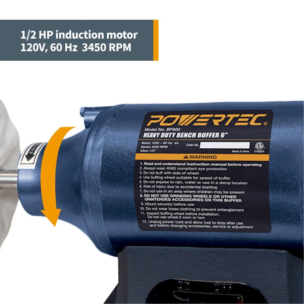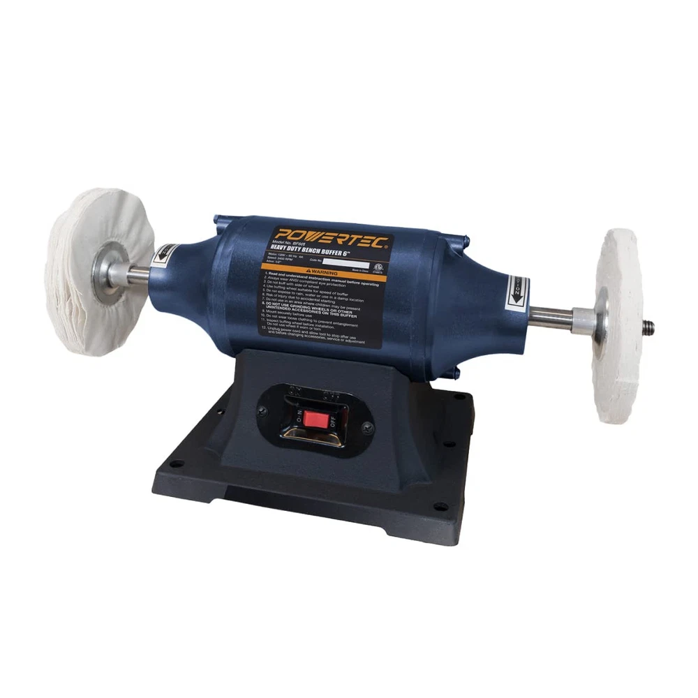 6" Bench Buffer by The BF601 is a dual end buffing machine designed for a variety of projects that require a smooth and polished surface. It's intended for an assortment of materials, including metal, aluminum, chrome, plastic and other materials. Heavy Duty Build and Performance Our benchtop buffer was constructed with a cast iron base that not only gives this machine a sturdy and grounded foundation, but it's designed to reduce vibration while in use. This key feature also helps eliminate potential damage to your work area or stock, often caused by vibrational buffering. In addition to a solid build, this tool is equipped with extra long, ball bearing supported precision machine shafts for highly durable performance. Compact Design with Big Capability No matter the project, if you require a smooth and polished finish, then this buffer machine has everything you need to get the job done. It features a powerful mid-ranged ½ horsepower induction motor that gives you project potential and versatility. The motor was carefully crafted and designed for long-term use. For simplicity, it flaunts an easy-to-use off/on switch ? producing a quick start-up that won? It stall when you need it the most. Equipped with 4 wheel flanges, 2 buffing wheels, and tightening nuts - this bench buffer is delivered complete and ready-to-use within minutes. is a US based manufacturer of high quality woodworking machines, wood work accessories, and a wide assortment of OEM replacement parts. We are committed to exceeding expectations, while bringing the best innovations, technologies, and product development to the industry. INCLUDES: 6" Bench Buffer Machine FUNCTION: An easy-to-use buffing station designed for a variety of buffing and polishing projects FEATURES: Dual end wheels for simultaneous polishing, a convenient off/on switch and extra long ball bearing supported machine shafts HEAVY DUTY BUILD: This benchtop buffer polisher was made with a cast iron base providing a weighted and stabilized platform for reduced vibration, while also eliminating potential damage often caused by vibrational buffering POWER BUFFER SPECS: 6" buffing wheel diameter, ½ horsepower induction motor, 120V, 60 Hz 3450 RPM