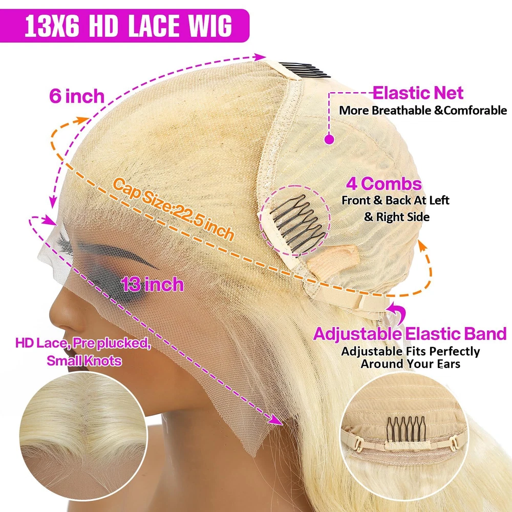 613 Lace Front Wig Human Hair Material:Blonde wig human hair made of Hight quality unprocessed Brazilian virgin human hair, the hair cut from young donor, healthy and vibrant, comfortable against skin.13x6 blonde human hair wigs HD transparent lace 200% density, full and thick, soft and natural, comfortable and vibrant, no shedding and tangle free Blonde Lace Front Wigs Human Hair Quality: Blonde body wave lace front wigs human hair , true to length, full and thick, shedding free, tangles free, no smell, soft, bouncy, can be dyed&bleached, straightened and restyled, can be side part, middle part, high ponytail& bun, styled as you like 13x6 Blonde Wig Human Hair Cap Size: 613 13x6 lace front wigs human hair with 22.5" medium cap (average size) with 4 combs and adjustable straps, durable & easy to adjust, fits for most customers heads perfectly. HD lace wigs human hair pre plucked with more baby hair around makes human wigs hairline more natural and beautiful 613 Body Wave Lace Front Wigs Human Hair Occasions: 613 wig can be dyed any color wigs human hair, and has a very natural look that is suitable for all occasions such as daily life, church, parties, weddings, dates, graduations, etc. In addition, this 613 blonde wig can be used as a gift for your own parents and friends on various holidays! Blonde Lace Front Wigs Human Hair Service: Professional Amazon logistics.We have a professional after-sales team, 24-hour customer service online.Our blonde human hair wig offering a secure and personalized wearing experience,if you have any questions about our 613 lace front wigs human hair, we will solve it for you in time