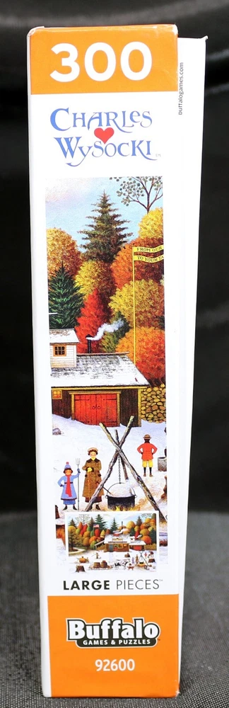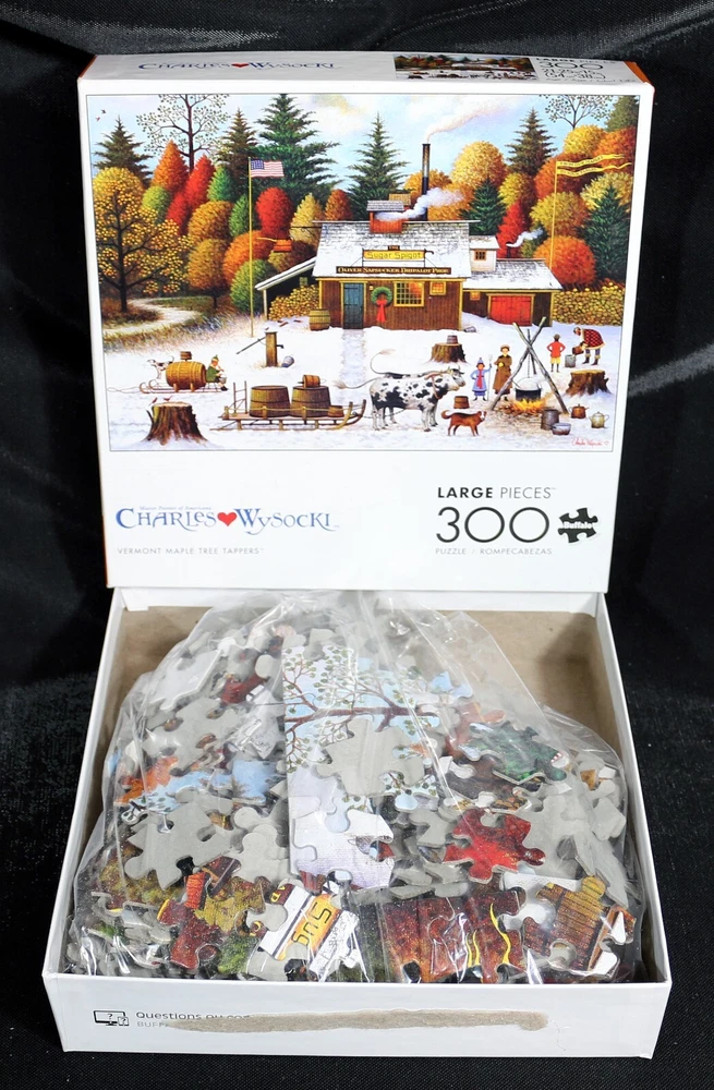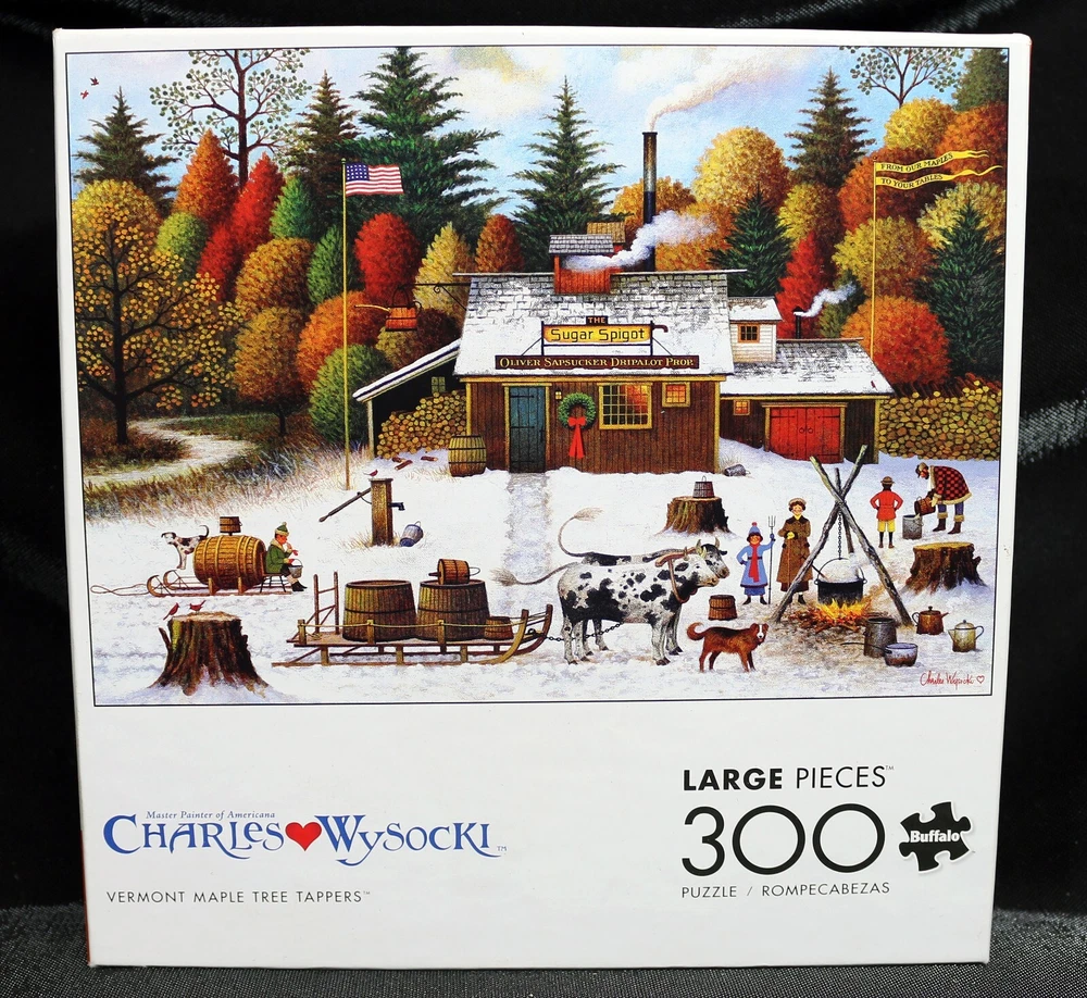 Experience the beauty of Americana with this 300-piece jigsaw puzzle featuring the iconic maple tree tapper design by Charles Wysocki & Buffalo Games. Made from recycled cardboard, this puzzle is perfect for puzzle enthusiasts who appreciate interlocking pieces. It comes from a smoke-free household. The puzzle is complete and comes with a recommended age range of 10+. Immerse yourself in the charm of Vermont with this puzzle that showcases the Americana theme. The puzzle is perfect for collectors and puzzle lovers alike. The Buffalo Games brand ensures that you are getting a high-quality product that is made in the United States. Add this puzzle to your collection today! Doing puzzles has some hidden benefits Excellent qualities : Cultivate concentration, patience, and temper your will Movement development : Train hand-eye coordination and precise small movements Spatial intelligence : Improve visual discrimination of colors and shapes Critical thinking ability : Understand the relationship between parts and the whole, and draw inferences from one example to explore the future Relaxes your mind : Relieve work pressure and release yourself Brain development : Enhance memory and may help prevent or slow brain degeneration Puzzle pieces are all bagged. Each item we ship is carefully packaged to prevent any damage and is shipped immediately with tracking. Anticipated Benefits of Puzzles for Children Overcoming attention deficit Strengthening visual memory Improving problem solving skills Strengthening hand-eye coordination Improve fine motor skills Improve gross motor skills Shape recognition ability Gain the ability of setting goals Learning patience