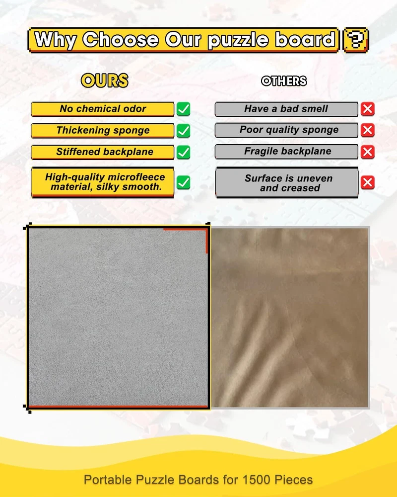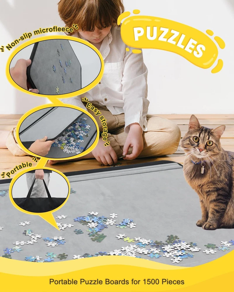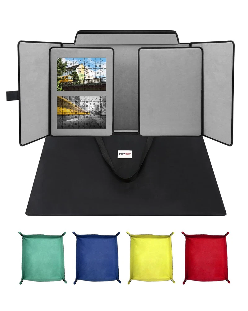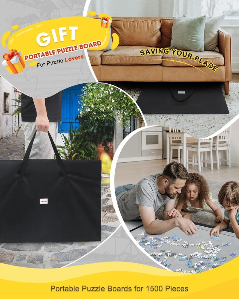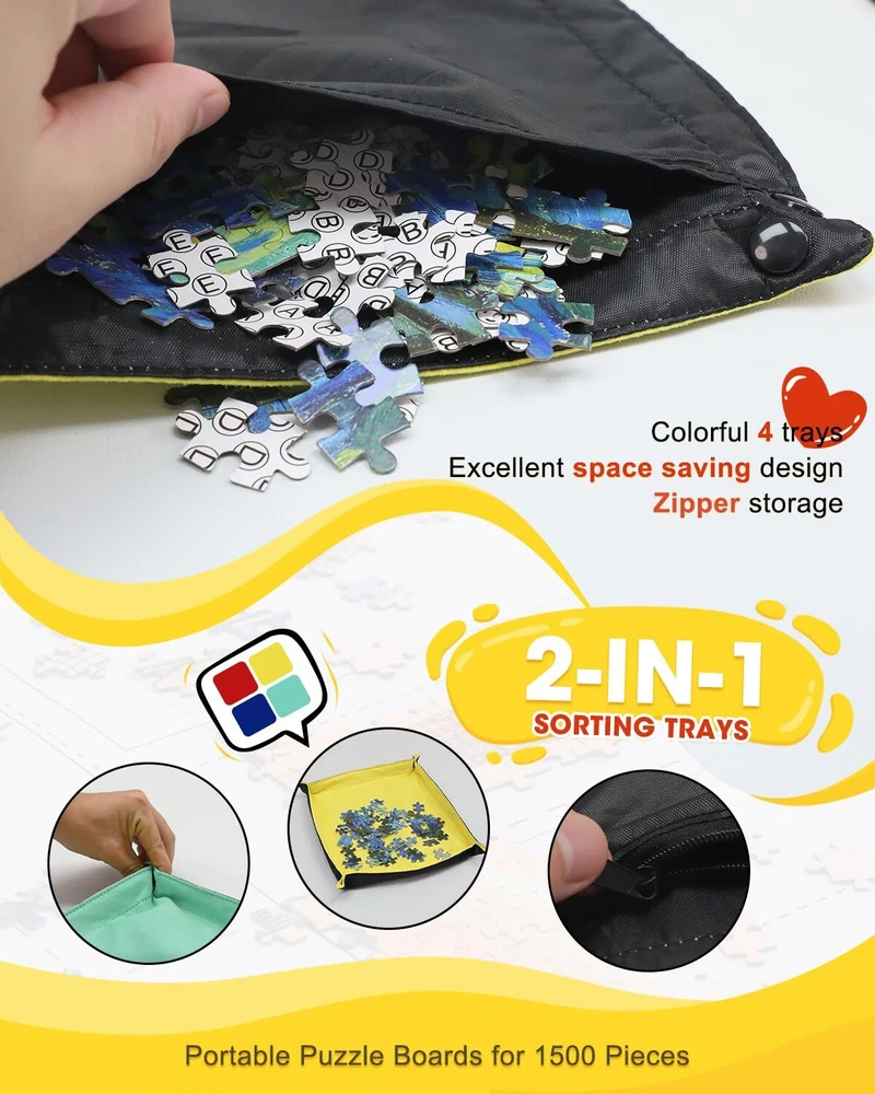 [Upgrade Your Puzzle Board] - Our portable puzzle board is perfect for storing, transporting and assembling your favorite puzzles. It has a flexible and sturdy carrying handle and black waterproof bag, as well as 2 separate puzzle mat that you can easily move around, while the portable design makes it safe from pets and children! it's lighter than traditional wooden storage racks and superior to other materials used for portable puzzle boards. [Perfect Size For Your Puzzles] -Our Folding puzzle table Unfolded size 73inch*26inch, and fits most 1500 piece puzzles. Plus, our 2-in-1 multi-purpose colorful puzzle sorting trays help you keep your puzzles organized. you can easily organize unfinished puzzles by 4 different color, picture, or edge pieces. Perfect for solo puzzlers or families. [Designed For Puzzle Lovers] - Our Puzzle Caddy Board With a high-quality zipper for a sturdy closure system, premium vegan leather for a stylish look and long-lasting durability, waterproof material for the safety of your masterpiece, non-slip microsuede work surface, and a sturdy carrying handle for easy maneuvering, you'll love the portability of jigsaw puzzle boards portable and find them a great solution for completing puzzles on the go. [Stay Organized] - Don't let your puzzles take over your space. Our Puzzle Storage Board is the perfect portable puzzle table for adults or anyone who wants to keep their puzzle boards organized and stored when not in use. With a removable puzzle board work surface, you can easily go from working on a puzzle to storing it. [Perfect Gift For Puzzle Lovers] - Looking for the perfect gift for the puzzle lover in your life? our beautifully designed portable puzzle caddy board is of the best puzzle accessories to use as a birthday gift, gift for mom, Father's Day gift, grandma gifts, especially during the holiday season like Thanksgiving and Christmas.