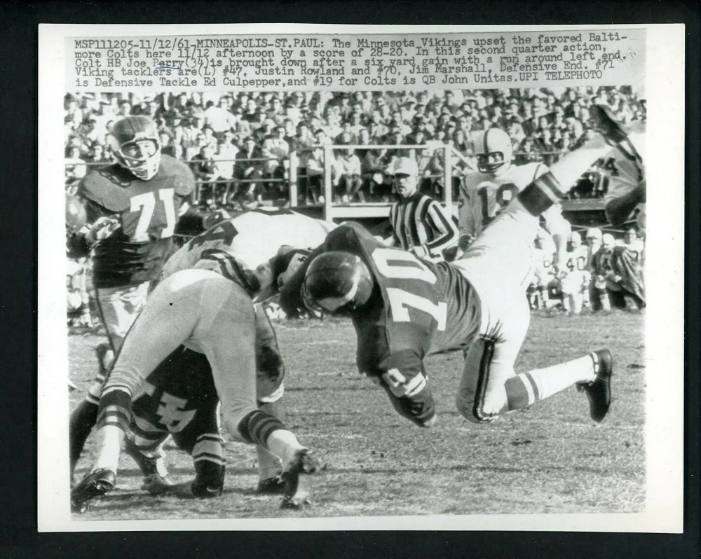 Colts quarterback Johnny Unitas watches teammate Joe Perry being tackled by Viking defenders including Jim Marshall and Ed Culpepper on this 7 x 9 Press photo. This UPI Press photo has the original news caption printed on front, dated 11/12/61. The photo has corner creases. Please check out the thousands of press photos I have available in my e-bay store. Shipping and handling is $3.99 for first class shipping for as many photos you may purchase to save $ on shipping charges as long as all photos are PAID AT THE SAME TIME WITH ONE PAYMENT. If you think you might buy multiple items from any seller that offers combined shipping, use the "Add To Cart" option under the "Buy It Now" button instead of the buy-it-now, and this will combine your purchases into one shipping charge as you add more items to your cart and purchase. Only make your payment after you have added all the items you want into your cart - you should then see that there is one charge for shipping when you go to make your payment. (H&S, 11-16, #1008)