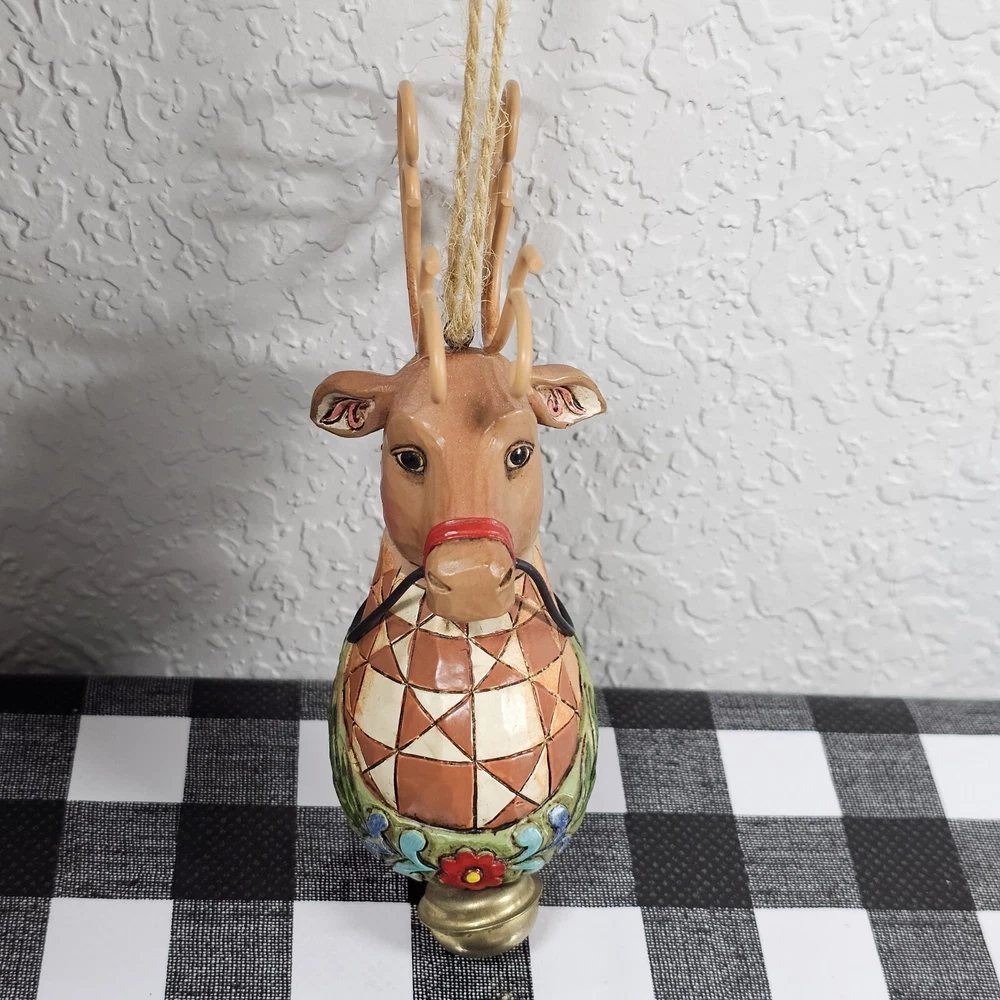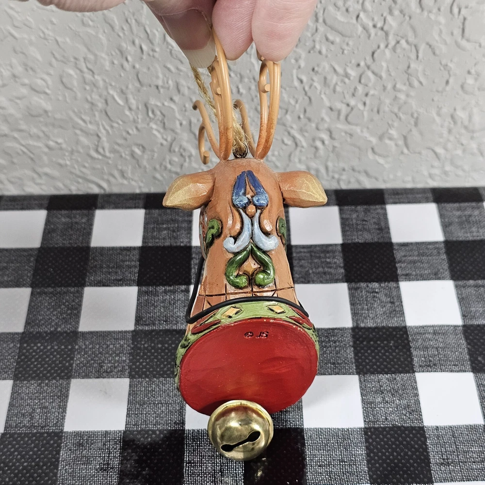 Jim Shore Reindeer w/ Dangle Bell Holiday Hanging Christmas Ornament Enesco 2010 We have decided to downsize our Christmas tree so I'm selling a BUNCH of our ornaments as well as some Christmas decor. Lots of vintage items. Most still have original packaging. Smoke free home. Sold as is. From artist Jim Shore - this is a beautifully crafted and painted reindeer ornament with a small bell attached. The ornament has the signature red and white plaid coloring, with a Christmas themed bottom. Nicely appointed antlers made from sturdy wire. Measures 5 inches long.