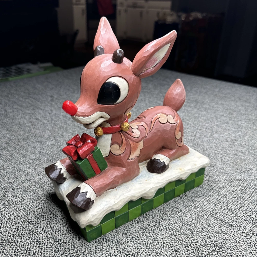 Requires 2x AAA batteries not included. The Jim Shore Rudolph The Red Nosed Reindeer figurine is a medium-sized collectible featuring a traditional style design. This 2015 manufactured figurine depicts Rudolph with an all-over red color and a matte finish. It includes a unique feature of a light-up nose, powered by AAA batteries. This original piece from the Jim Shore collection is 7 inches in length, 9 inches in height, and 4 inches in width, making it a festive addition to any holiday decor with its animated theme of Rudolph the Red-Nosed Reindeer.