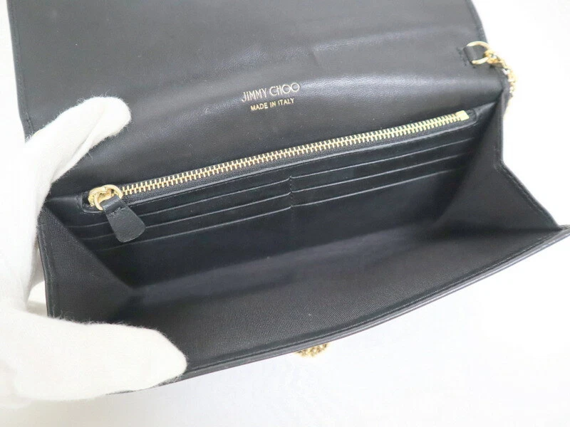 This Jimmy Choo wallet is absolutely stunning! The black leather is sleek and luxurious, and the studded chain detail adds the perfect edgy touch. It arrived securely packaged and in great condition. Shipping was fast, and the seller was professional. Very happy with this purchase—it’s both stylish and functional!