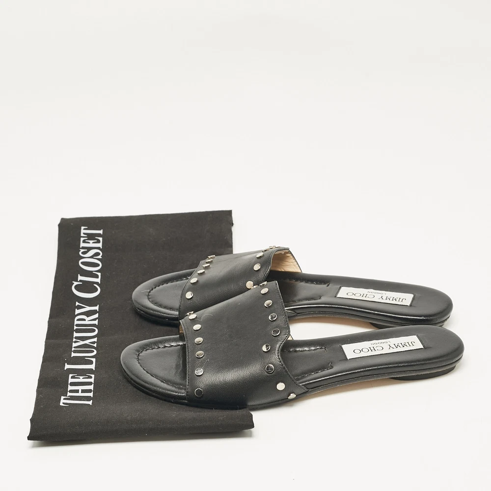 Wear these slides on days when you cannot choose between fashion and comfort, for they bring both. They are made from Jimmy Choo, made from leather, and embellished with studs.Certified by The Luxury Closet - This item has gone through a detailed authentication process overseen by our experts. We offer a lifetime guarantee of authenticity on all our items. Import duties, taxes and charges are not included in the item price. These charges are the buyers responsibility. Please check with your country’s customs office to determine what these additional cost will be prior to buying. Our eBay Store About Us Contact Us Add to Favorite Sellers Jimmy Choo Black Leather Studded Nanda Flat Slides Size 37 $163.9 Wear these slides on days when you cannot choose between fashion and comfort, for they bring both. They are made from Jimmy Choo, made from leather, and embellished with studs. Product Details Brand Color Black Dimensions Material Leather Size 37 Outsole Width 9.5 cm Outsole Length 24.5 cm Heel Height Includes The Luxury Closet Packaging Certified by The Luxury Closet This item has gone through a detailed authentication process overseen by our experts. We offer a lifetime guarantee of authenticity on all our items. How We Check The in-house team of experts at The Luxury Closet is highly trained to verify the authenticity and the condition of the luxury products. They ensure that only 100% authentic items are put on sale.The evaluation process is unique with its own mix of assessment criteria and differs according to the category. Each item is evaluated based on the following combination of hallmarks, hardware, stitching, symmetry, material, craftsmanship, stamping, codes, hologram stickers, and packaging. Our authenticators also check if the items have been modified or amended (e.g., aftermarket diamonds, replaced batteries, repaired bags, etc.) International Buyers Import duties, taxes and charges are not included in the item price. These charges are the buyers responsibility. Please check with your country’s customs office to determine what these additional cost will be prior to buying.