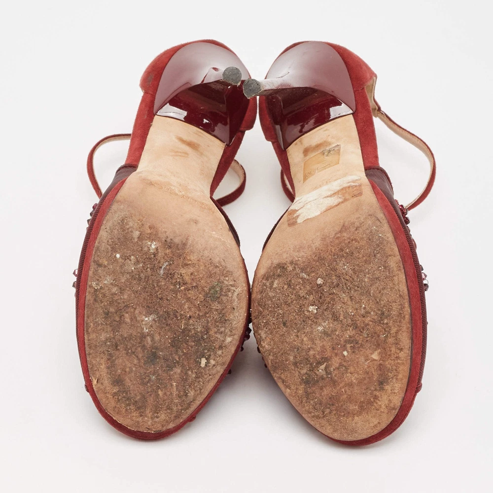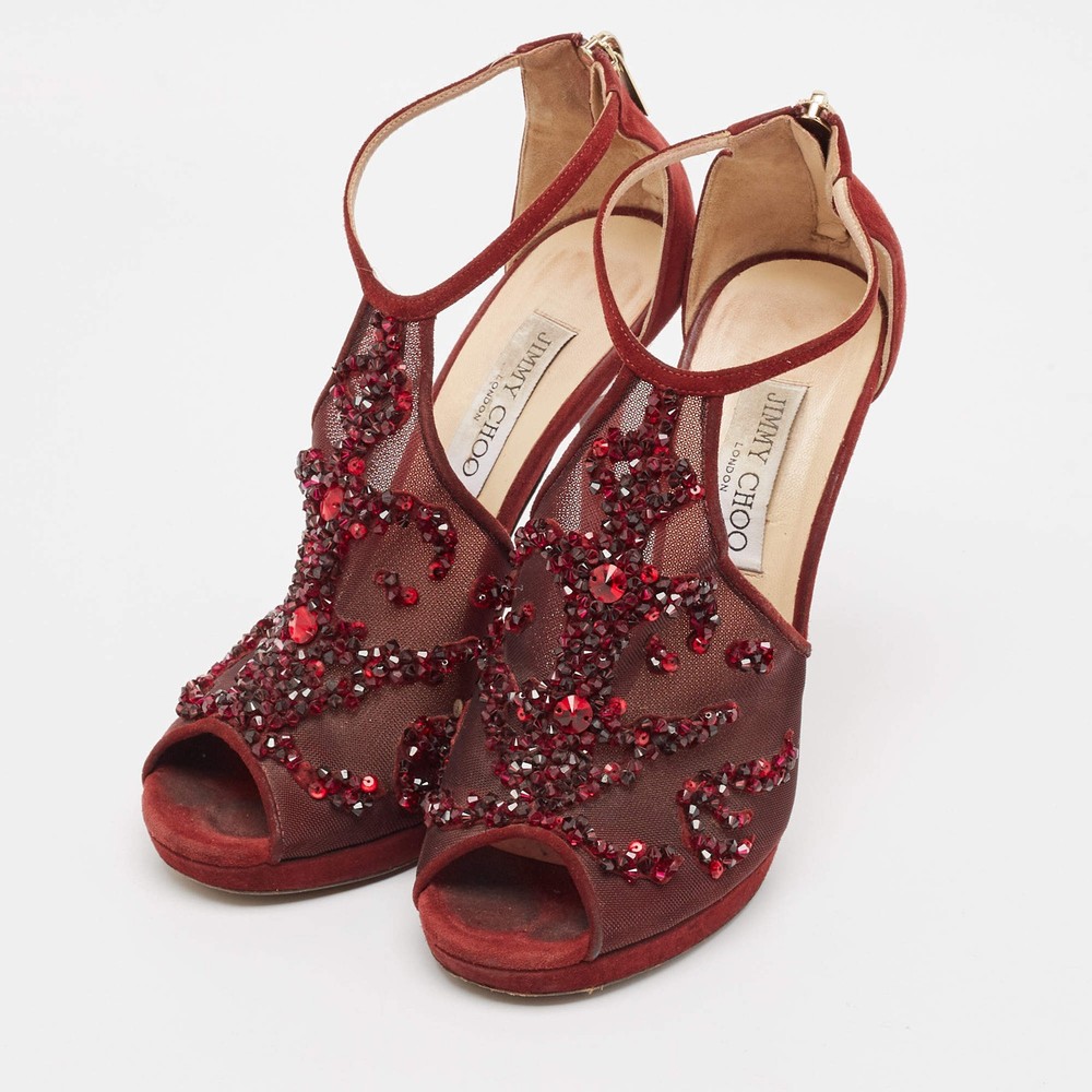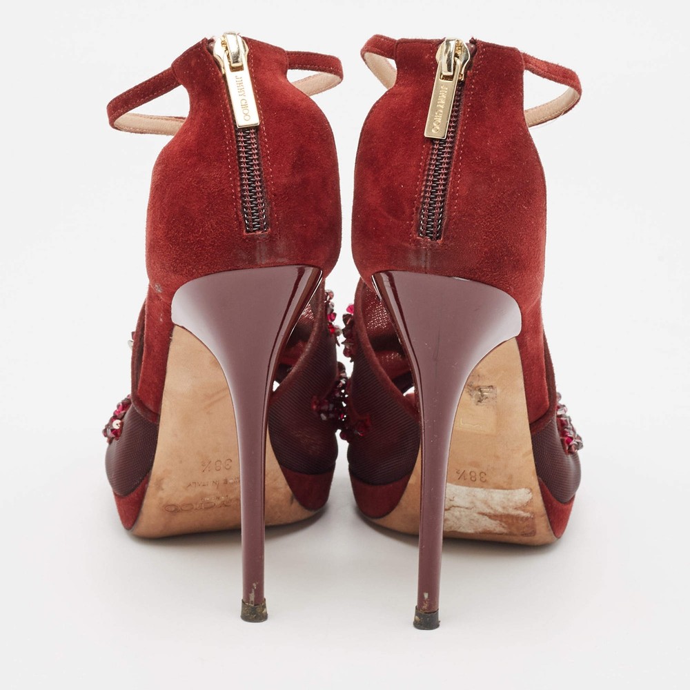 Our eBay Store About Us Contact Us Add to Favorite Sellers Jimmy Choo Burgundy Mesh and Suede Embellished Ankle Strap Sandals Size 38.5 These sandals will frame your feet in an elegant manner. Crafted from quality materials, they display a classy design and comfortable insoles. Product Details Brand Jimmy Choo Color Burgundy Includes The Luxury Closet Packaging Outsole Length 21cm Outsole Width 7.5 cm Size 38.5 Certified by The Luxury Closet This item has gone through a detailed authentication process overseen by our experts. We offer a lifetime guarantee of authenticity on all our items. How We Check The in-house team of experts at The Luxury Closet is highly trained to verify the authenticity and the condition of the luxury products. They ensure that only 100% authentic items are put on sale.The evaluation process is unique with its own mix of assessment criteria and differs according to the category. Each item is evaluated based on the following combination of hallmarks, hardware, stitching, symmetry, material, craftsmanship, stamping, codes, hologram stickers, and packaging. Our authenticators also check if the items have been modified or amended (e.g., aftermarket diamonds, replaced batteries, repaired bags, etc.) International Buyers Import duties, taxes and charges are not included in the item price. These charges are the buyers responsibility. Please check with your country’s customs office to determine what these additional cost will be prior to buying.