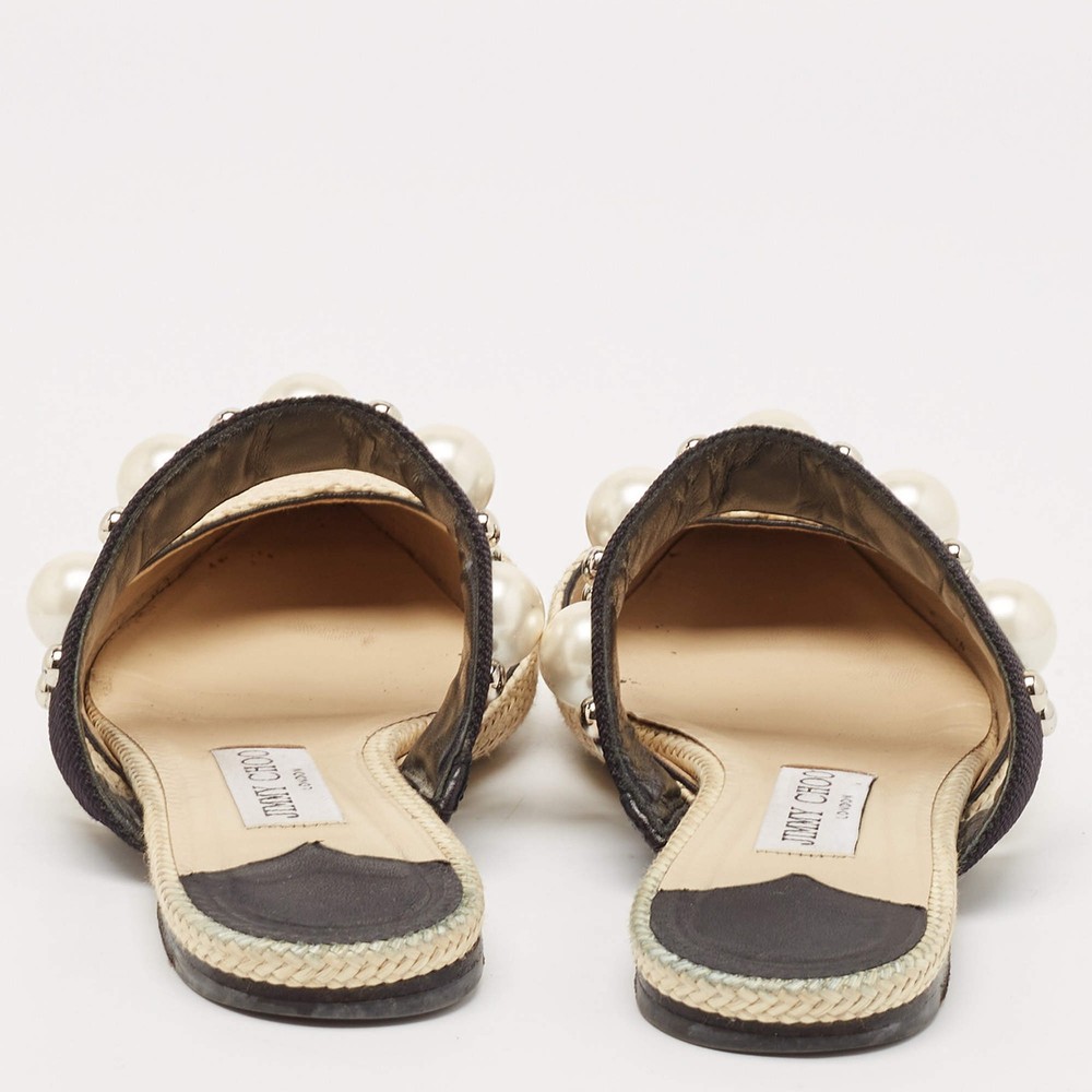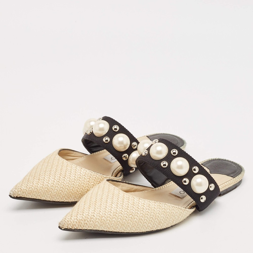 Our eBay Store About Us Contact Us Add to Favorite Sellers Jimmy Choo CreamBlack Canvas and Raffia Embellished Mules Size 37.5 A perfect blend of luxury, style, and comfort, these designer mules are made using quality materials and frame your feet in the most elegant way. They can be paired with a host of outfits from your wardrobe. Product Details Brand Jimmy Choo Color Cream Includes The Luxury Closet Packaging Outsole Length 27 cm Outsole Width 8 cm Size 37.5 Certified by The Luxury Closet This item has gone through a detailed authentication process overseen by our experts. We offer a lifetime guarantee of authenticity on all our items. How We Check The in-house team of experts at The Luxury Closet is highly trained to verify the authenticity and the condition of the luxury products. They ensure that only 100% authentic items are put on sale.The evaluation process is unique with its own mix of assessment criteria and differs according to the category. Each item is evaluated based on the following combination of hallmarks, hardware, stitching, symmetry, material, craftsmanship, stamping, codes, hologram stickers, and packaging. Our authenticators also check if the items have been modified or amended (e.g., aftermarket diamonds, replaced batteries, repaired bags, etc.) International Buyers Import duties, taxes and charges are not included in the item price. These charges are the buyers responsibility. Please check with your country’s customs office to determine what these additional cost will be prior to buying.