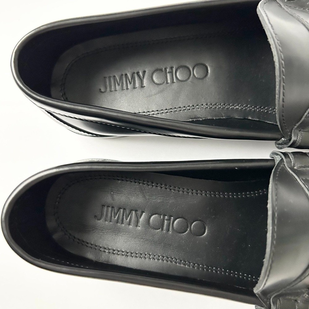Jimmy Choo Mocca Gold Tone Star Chain Loafers in Black Leather. Brand new without tags or box. Size 39 IT, 9 US. Jimmy Choo black leather moccasin loafers showcase a sophisticated blend of classic tailoring and whimsical detail. Crafted in Italy from premium smooth shiny calf leather, these flats feature a distinctive gold-tone star chain embellishment across the vamp, adding a celestial touch to the traditional penny loafer silhouette. The almond toe and slight block heel provide a timeless profile, while the tonal stitching and leather soles ensure durability and comfort for all-day wear. Material: Smooth Leather Hardware: Gold-tone Star Chain Toe Shape: Almond Heel Type: Low Block Heel Origin: Made in Italy Style: Penny Loafer Celestial, Dark Academia, Preppy, Luxury, Designer, Starry, Office Wear, Minimalist, Italian Leather, Chic, Classic, Sophisticated, Statement Shoe SKU 7725