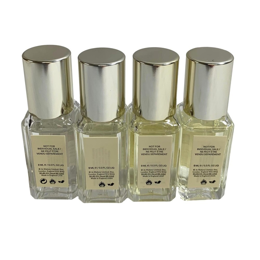Jo Malone 4pc Cologne Eng Pear Freesia, Fig, Orange & Slvr Birch Lavender 9ml/ea English Pear & Freesia - Orchards steeped in golden sunshine, warming the russet curves of luscious pears. The sensuous freshness of the just-ripe fruit wrapped in elegant white freesias, enhanced with rose and rooted in patchouli. Fig Artemisia - Comfort and joy. Wrapped up in the spirit of the season, the woodiness of fir and aromatic artemisia is contrasted with supple leather in this festive scent. Aromatic with bitter facets, artemisia's freshness brings balance to the sensual leather notes. Patchouli is a sensuously deep woody note that enhances the longevity of the fragrance. The verdancy of oakmoss cushions the base of the fragrance in earthy, woody warmth. Orange Bitter -Take a dash of sweet orange and a burst of ripe mandarin. Finish with a splash of bitter orange to reveal rich prune and a base of sensual sandalwood and amber. Silver Birch & Lavender - Rays of dawn light across a forest clearing, framed by a canopy of silver birch trees. The woody coolness of this striking tree cuts through aromatic English lavender. A refreshing squeeze of grapefruit and a compelling note of roasted oak complete this fresh, stimulating fragrance. All our products are 100% authentic from our distributor and are stored in a climate controlled, pet-free, smoke-free environment. Please ask questions before purchasing as we do not accept returns for makeup or personal hygiene products. Please check back often as our products are always changing.