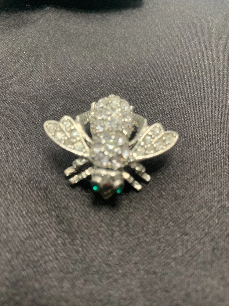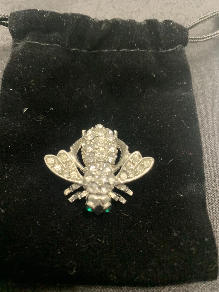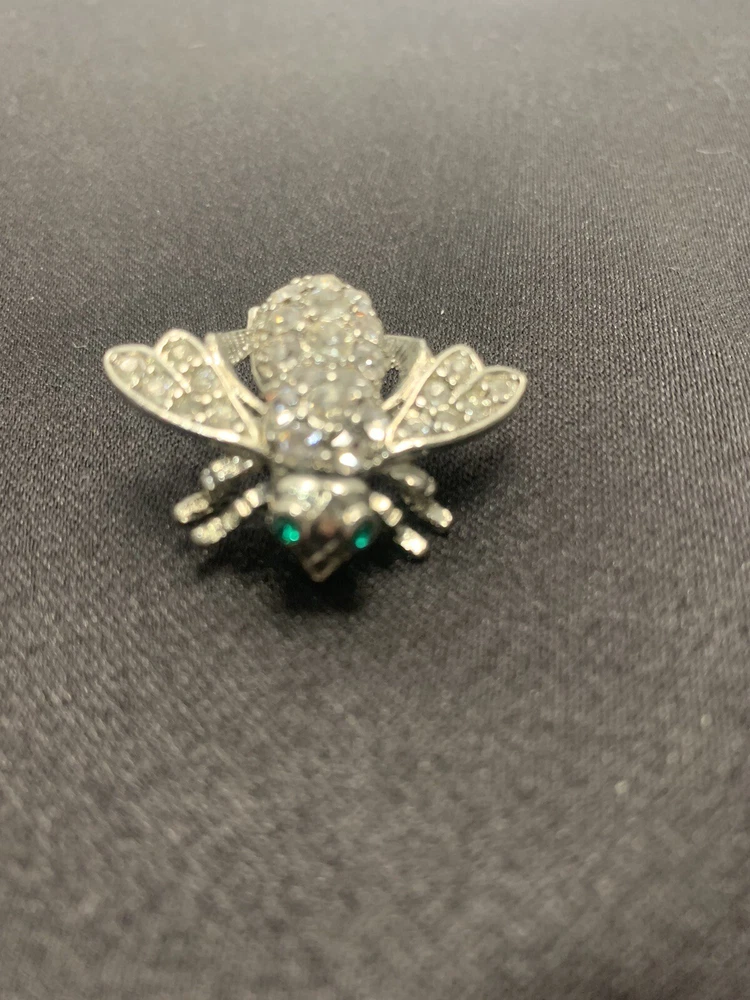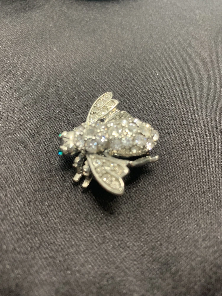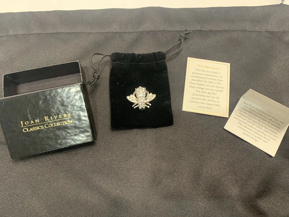 Add a touch of nature-inspired glamour to any outfit with this stunning Joan Rivers Rhinestone Bumble Bee Brooch/Pin. The pin features sparkling rhinestones and green eyes that perfectly complement the silver-colored metal and enamel material. The round-shaped moonstone main stone and multiple opals and crystals add a touch of elegance to the piece. The pin is signed by Joan Rivers and is perfect for any occasion, including Mother's Day, Graduation, Anniversary, Birthday, Christening, and Confirmation/Communion. Get this unique brooch/pin as a gift for your loved ones or add it to your collection today!