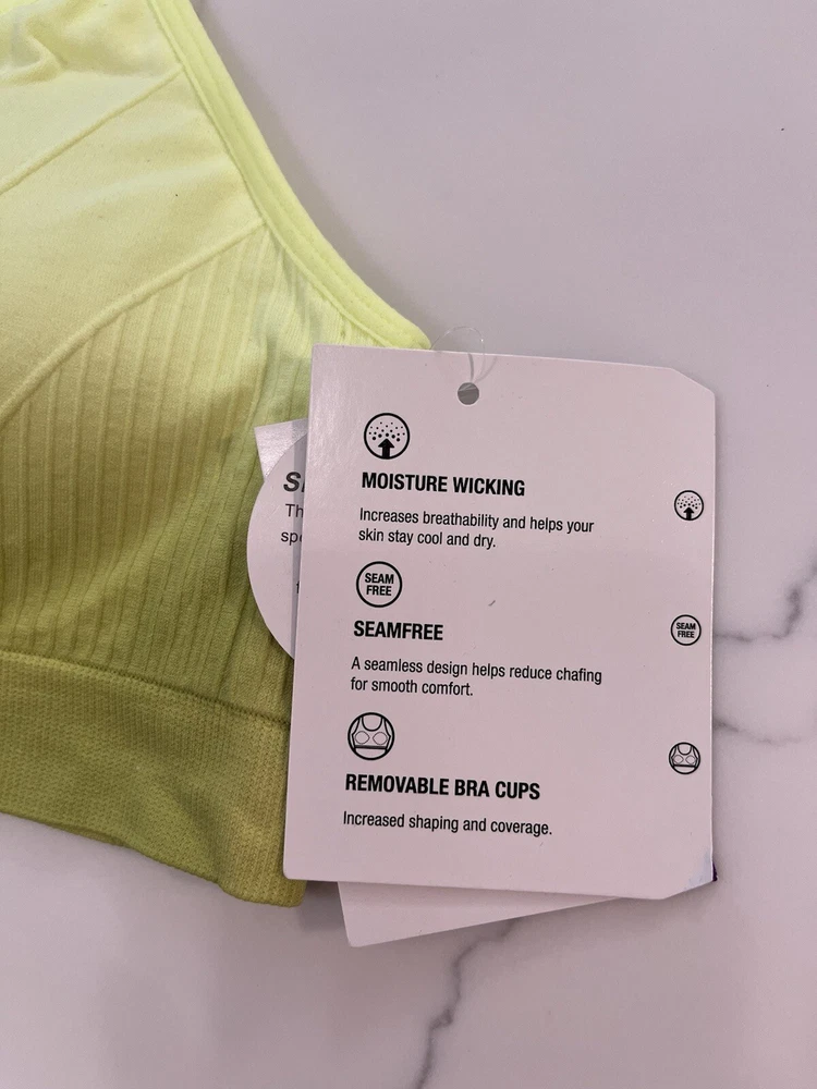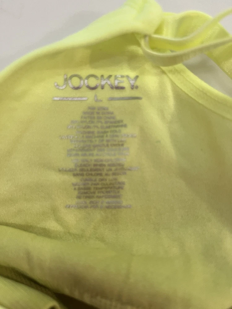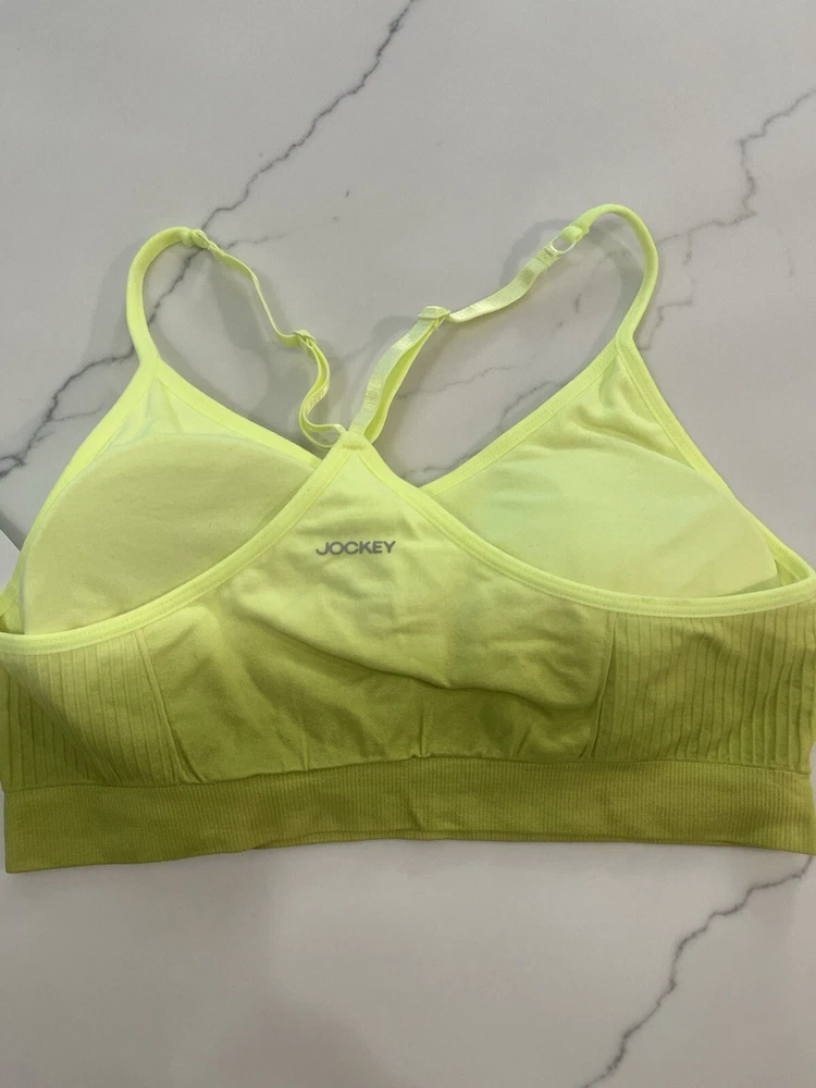 Support Level: Medium Band Size: L Pattern: Solid Fabric Type: Blended Fabric Size Type: Regular Back Style: Racerback Brand: Jockey Strap Type: Racerback Size: L Closure: Pullover Type: Bra Material: 92% Nylon, 8% Spandex Features: Seamless, Adjustable Straps Department: Women Underwire Type: Wireless Color: Yellow Performance/Activity: Yoga Style: Sports Bra Occasion: Activewear Activity: Yoga