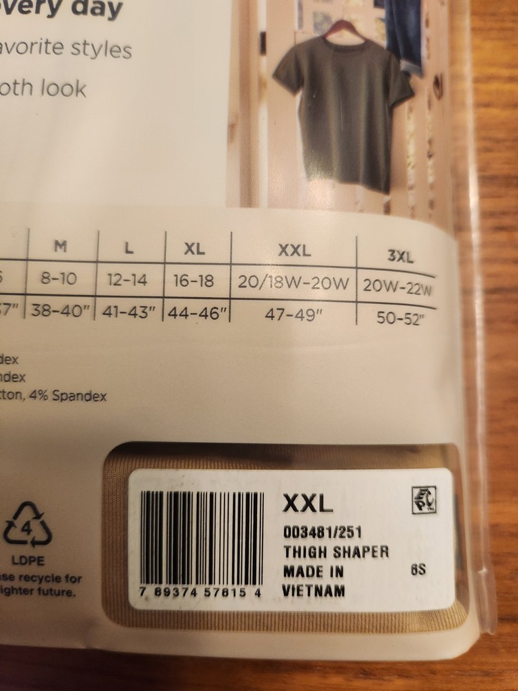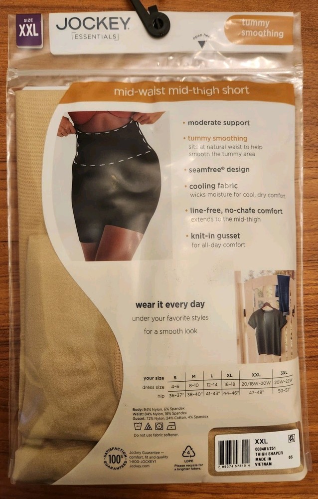 Brand new, isn original package, Jockey Essentials Women's XXL Tummy Shaping THIGH SHAPER / Mid-Waist Mid-Thigh Short. Color is BEIGE. Moderate support. See photos for more product details. Absolutely in brand new, perfect, tag attached condition. Visit my eBay Store for LOTS more Jockey undergarments. This item comes from a pet free and smoke free environment. I will ship your item via USPS within 1 business day of receiving your cleared payment. International shipping available. Don't forget to visit my eBay Store and add kidsbargainspot to your list of favorite sellers! Sales tax for your applicable state may apply.