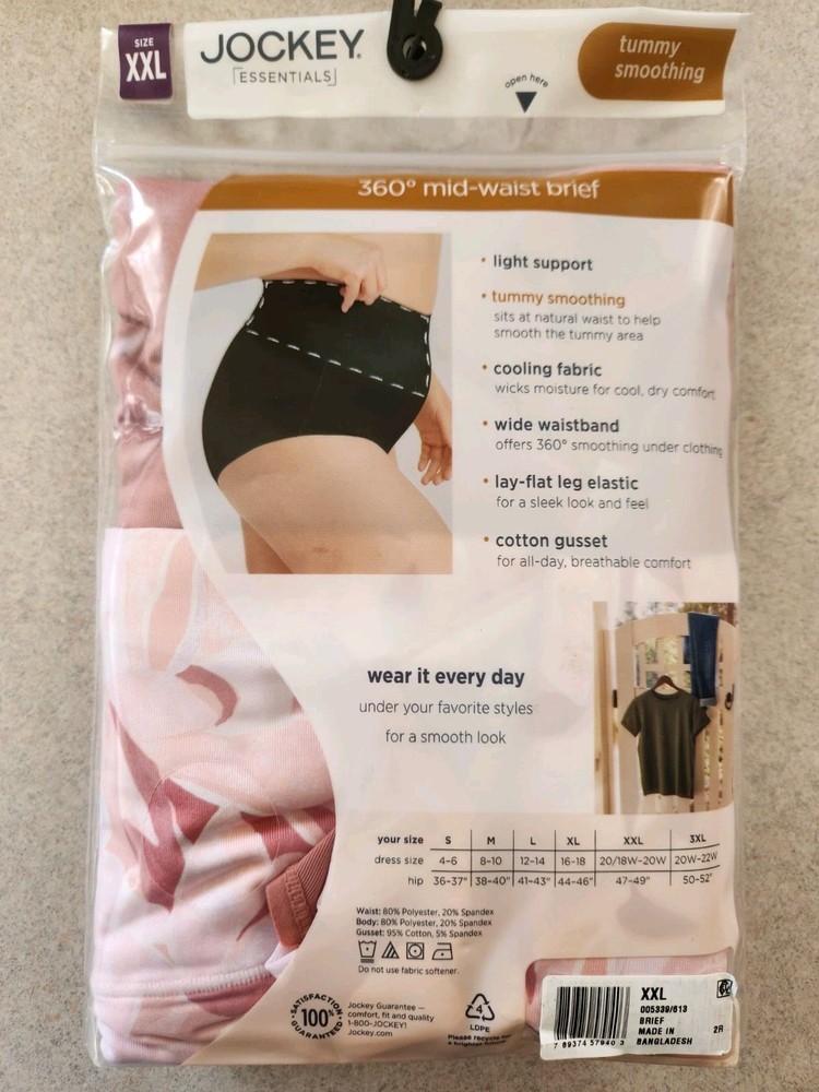 Brand new, in original package, Jockey Essentials XXL Women's 2 PACK Tummy Smoothing 360 Mid-Waist Briefs. Color is ROSE / PINK FLORAL. See photos for more product details. Absolutely in brand new, perfect condition. Visit my eBay Store for LOTS more Jockey shapewear and underwear. This item comes from a pet free and smoke free environment. I will ship your item via USPS within 1 business day of receiving your cleared payment. International shipping available. Don't forget to visit my eBay Store and add kidsbargainspot to your list of favorite sellers! Sales tax for your applicable state may apply.
