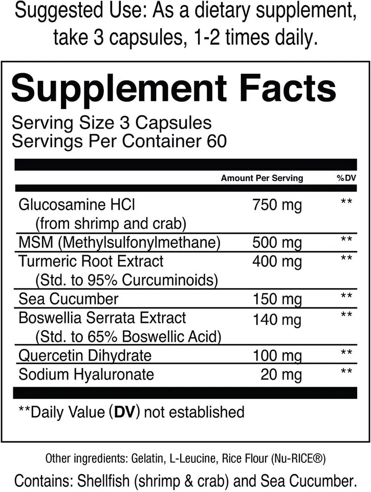 oint Warfare offers natural anti-inflammatory compounds, plus ultra-strength joint support. This formula was developed for people recovering from joint injuries to help relieve pain and accelerate healing. Joint Warfare is now the daily supplement of choice for those in the know. Years of joint abuse and use add up, causing unnecessary joint pain. Joint Warfare gives you the edge against old age and wear and tear and offers effective joint support. Joint Warfare is a joint support product that helps alleviate joint pain and inflammation in your joints. It promotes joint health and improves joint mobility and flexibility. It also protects your joints to keep them in good condition even as life, training, and physical activity all take a toll. As we age, we put wear and tear on our joints, so we should protect and provide them with the necessary nutrients to heal. Joint Warfare is the only joint support you need. MSM has also been scientifically shown to reduce joint stiffness. MSM protects against oxidative damage and helps with soreness from exercise and post-exercise recovery. It supports the production of glutathione and can actually improve the ratio of oxidized to non-oxidized glutathione so that you have a greater ability to deal with free radicals and control oxidative stress. Turmeric and curcumin are natural anti-inflammatory supplements. The active ingredient in boswellia, boswellic acid, has unique properties that provide hope for people suffering from many inflammation-related conditions. At Origin Labs, we use only the highest quality ingredients—no proprietary blends are used for any products. Origin is transparent about the milligram amount used for each ingredient and every product is tested by a third party laboratory for accurate labeling. Our products are only produced in FDA registered and GMP compliant facilities. JOINT SUPPLEMENT: A complete dietary supplement for your joints to help with age & wear issues, promote joint mobility and flexibility, and keeps your joints in top condition. 7 POWERFUL ACTIVE INGREDIENTS: Glucosamine HCI, MSM (Methylsulfonylmethane), Turmeric Root Extract, Sea Cucumber, Boswellia Serrata Extract, Quercetin Dihydrate, Sodium Hyaluronate JOINT PROTECTION AND SUPPORT: Strengthen and support your joints for added mobility and endurance and to protect from age and wear issues. MSM (Methylsulfonylmethane) is used to reduce joint stiffness and stress, while Sea Cucumber has been used for centuries to promote collagen health in joint cartilage. INCREASED MOBILITY FOR A MORE ACTIVE LIFESTYLE: Taking care of your joints has more benefits than just pain mitigation and prevention: it enables and promotes an active lifestyle for years to come. Feel younger and be more active. IDEAL FOR DAILY USE: We recommend taking 3 capsules 1 time daily for regular maintenance. For extreme support and recovery, use 3 capsules twice daily.