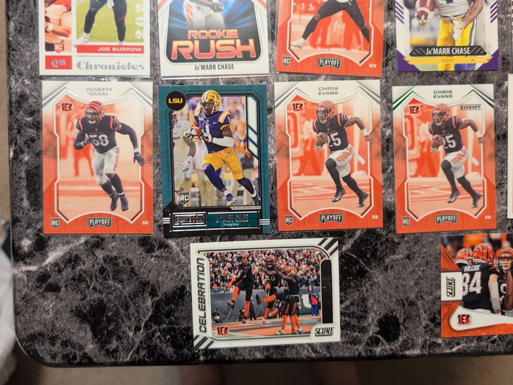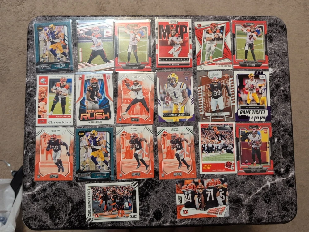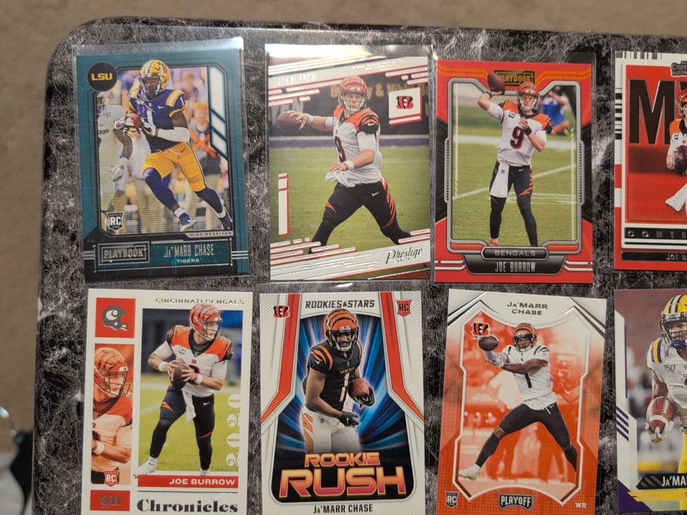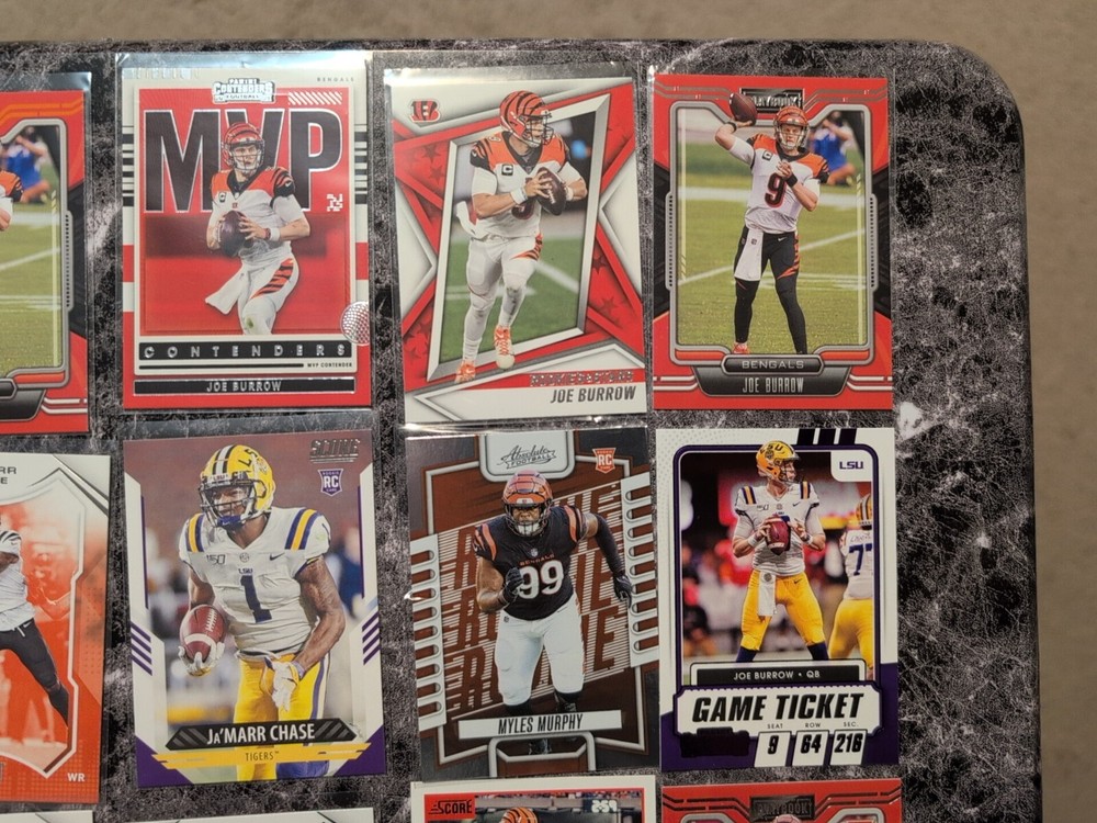 This Cincinnati Bengals NFL Team Card Lot includes a total of 20 cards featuring rookie players like Joe Burrow, Tee Higgins, and Ja'Marr Chase. The cards are from the 2022 Panini Donruss Optic and 2022 Panini Select sets, manufactured in 2020 by Panini. The collection includes base set cards, rookie cards, parallel cards, and inserts, all made of card stock. These sports trading cards are in English and are original licensed reprints, perfect for fans and collectors of the Cincinnati Bengals and the NFL.