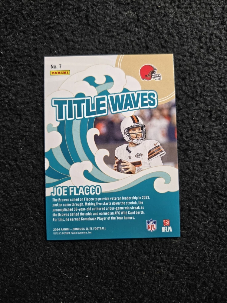 Set: 2024 Panini Elite Sport: Football Parallel/Variety: Green Title Waves Type: Sports Trading Card League: National Football League (NFL) Autographed: No Manufacturer: Panini Team: Cleveland Browns Card Number: 43 Card Name: Green Title Waves Player/Athlete: Joe Flacco Features: Insert, Parallel/Variety Season: 2024