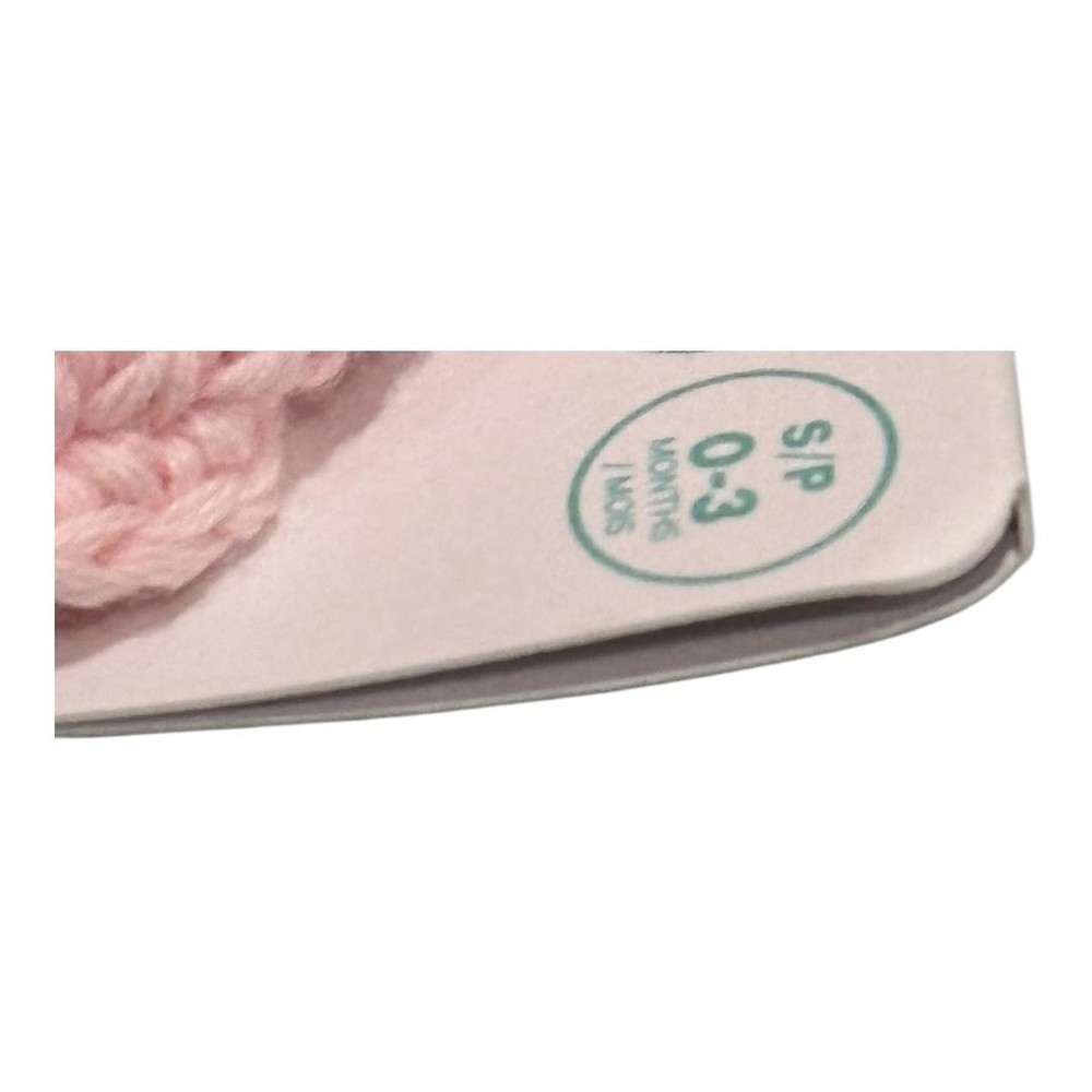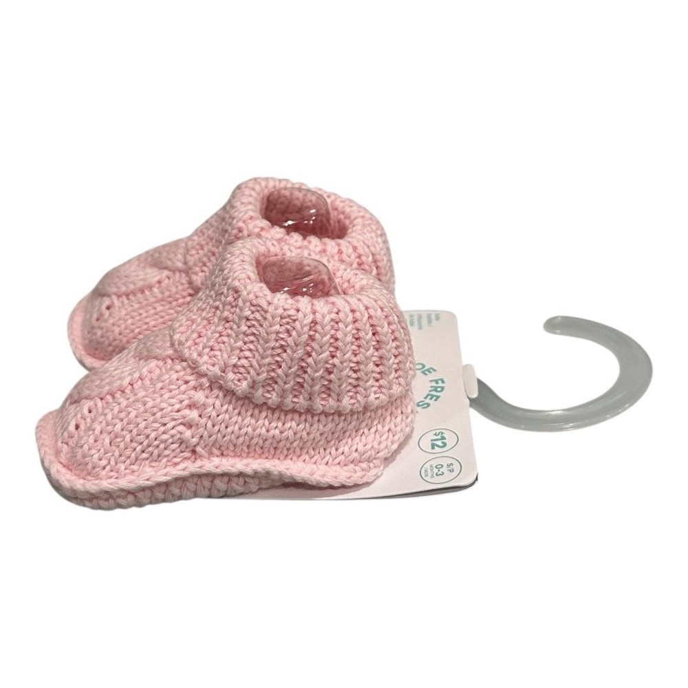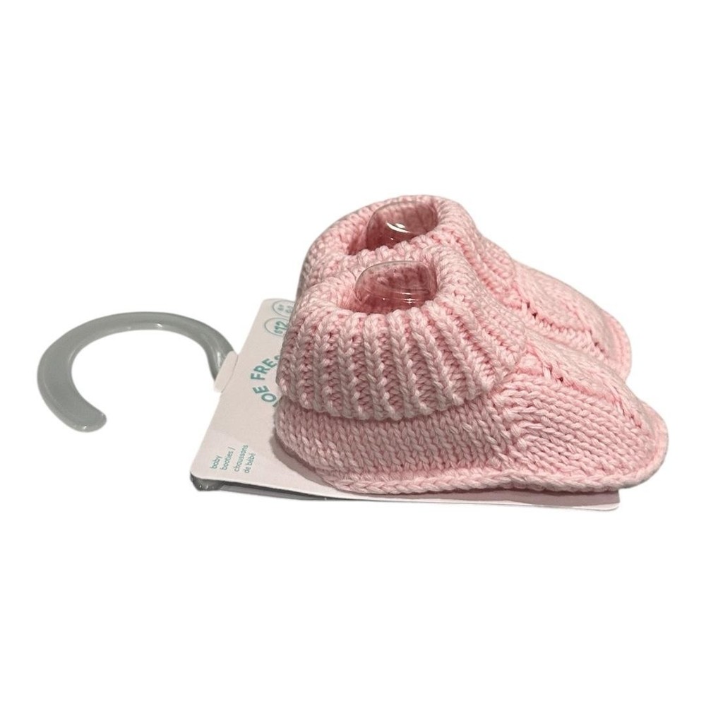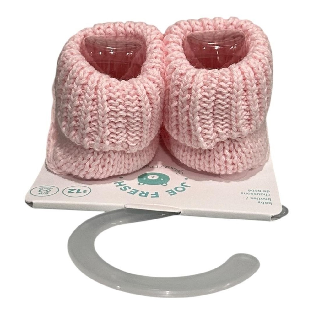 Brand: Joe Fresh Style: Baby slipper booties with soft knit construction, ribbed foldover cuffs, and cozy crib-friendly design. Color: Light pink solid knit; Department: Girls; Size: 0-3 months. Materials: Fabric upper with knit texture, fabric lining and insole, soft fabric outsole; not suitable for walking; machine wash cold and tumble dry low per tag. Made in China; Style/Model code: F0GB011987; UPC: 041360683656.