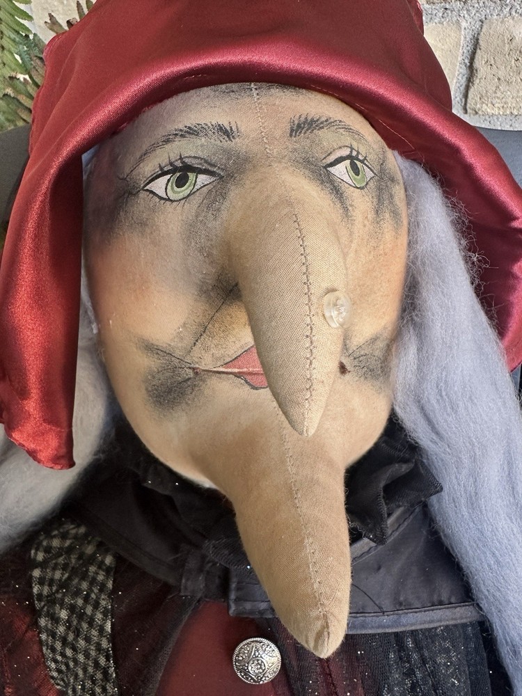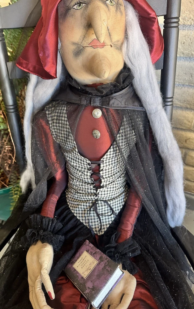 Original Joe Spencer Winnie witch doll. Extra large. Came to us without her hat, made her a new one matching as closely as possible. She’s worth the work, amazing doll. List price reflects the hat modification. Please see photos for any questions and or clarification. Winnie would be a nice addition to your Halloween collection.