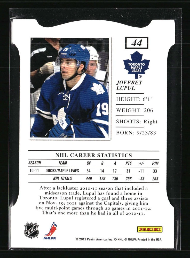 Graded: No Manufacturer: Panini Elite Player/Athlete: Joffrey Lupul Season: 2011 Team: Toronto Maple Leafs Card Number: 44 Year Manufactured: 2011 Type: Sports Trading Card Sport: Hockey Autographed: No League: NHL Set: Panini Elite