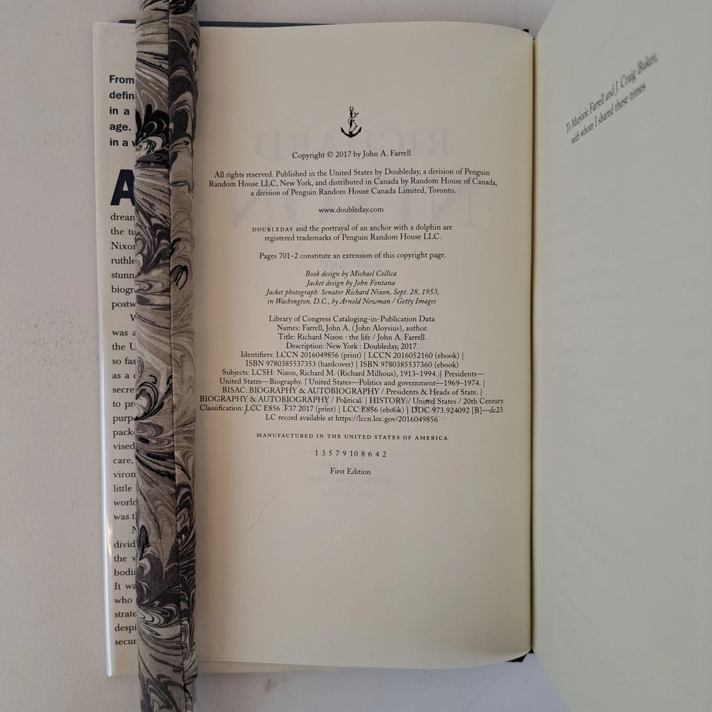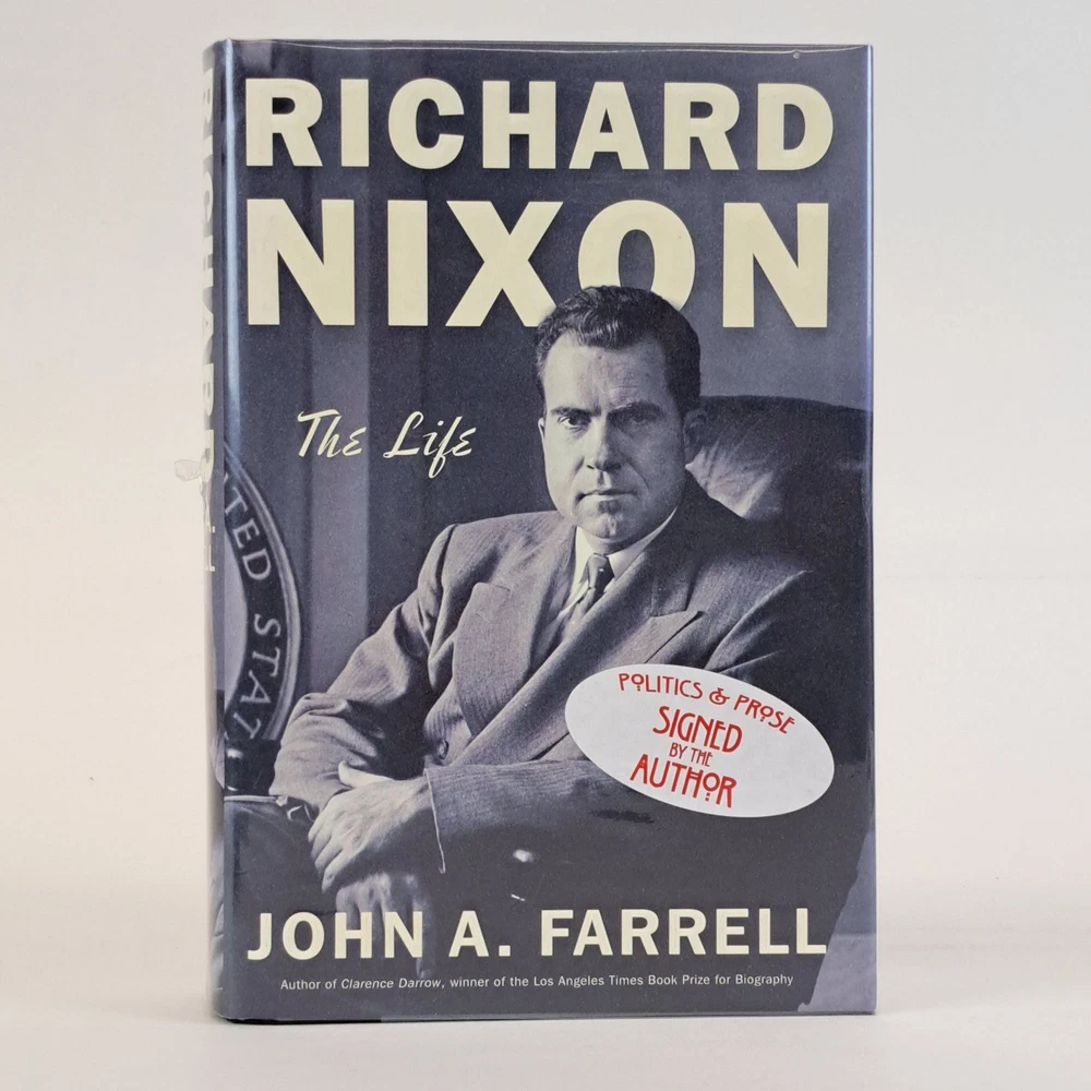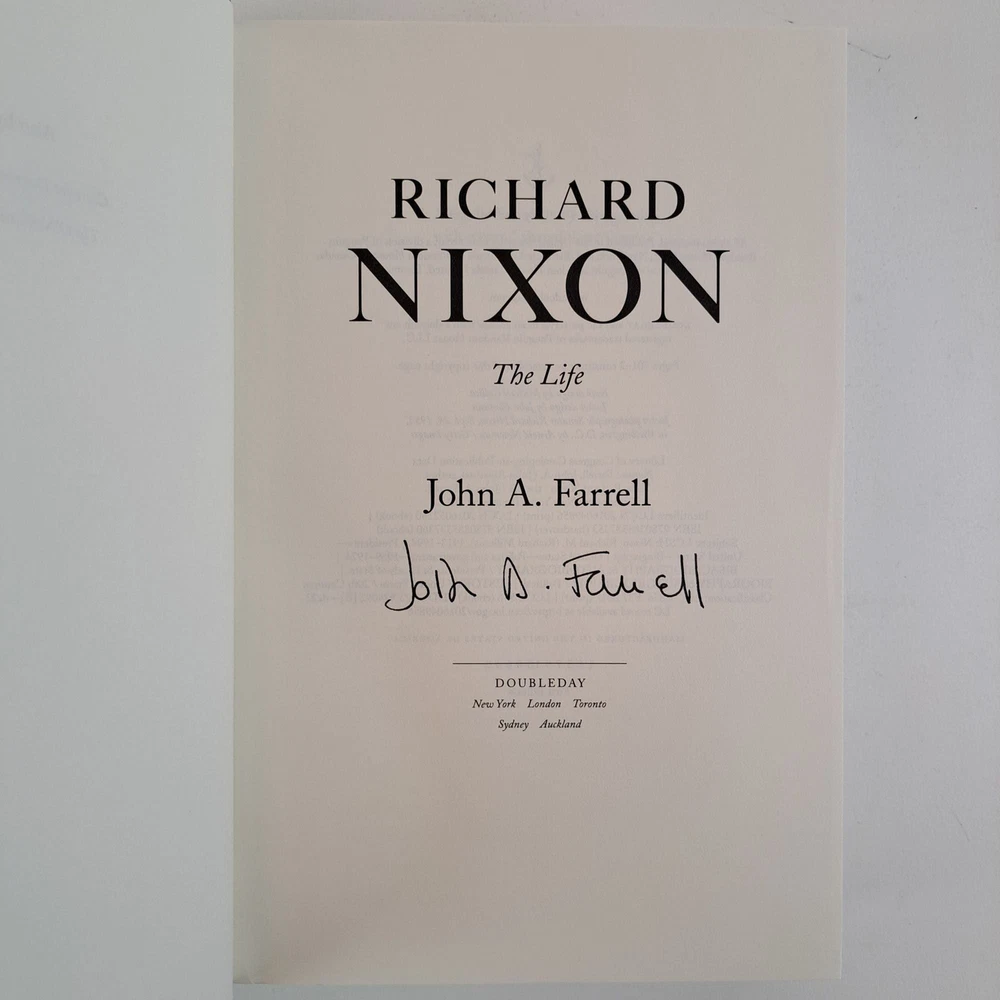 RICHARD NIXON: THE LIFE [Signed] Author: Farrell, John A. Title: RICHARD NIXON: THE LIFE [Signed] Publication: New York, New York: Doubleday, 2017 Edition: First Edition, First Printing Description: Octavo, 737 pages. In Very Good condition with Near Fine condition dust jacket. Spine is grayish blue with raised white lettering and a portrait of Richard Nixon. Dust jacket wrapped in mylar covering, price uncut: "$35.00" on front flap. Boards have mild shelving wear to joints and along spine tail. Signed flat by John A. Farrell on title page. Shelved in hallway. Seller ID: 1389360 Subject: Biography & Autobiography, US History Welcome to the eBay store of Second Story Books! DC's Oldest Rare and Used Bookstore, Second Story Books operates two open shops in the Washington D.C. metropolitan area. We have an extensive internet presence and provide accredited appraisals member ASA. This listing was created by Bibliopolis.